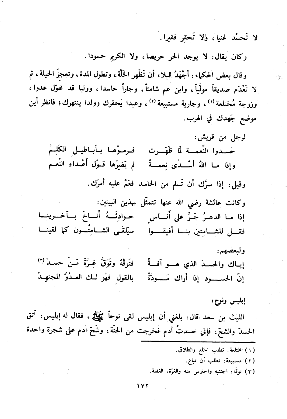 الليث بن سعد قال: بلغني أن إبليس لقى نوحا صلّى الله عليه وسلم، فقال له إبليس: اتق الحسد والشحّ، فإني حسدت آدم فخرجت من الجنّة، وشحّ آدم على شجرة واحدة