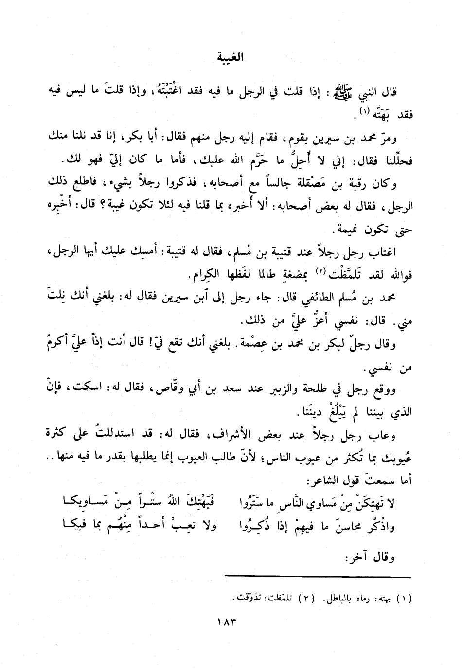 قال النبي صلّى الله عليه وسلم: إذا قلت في الرجل ما فيه فقد اغتبته، وإذا قلت ما ليس فيه فقد بهتّه «1» .