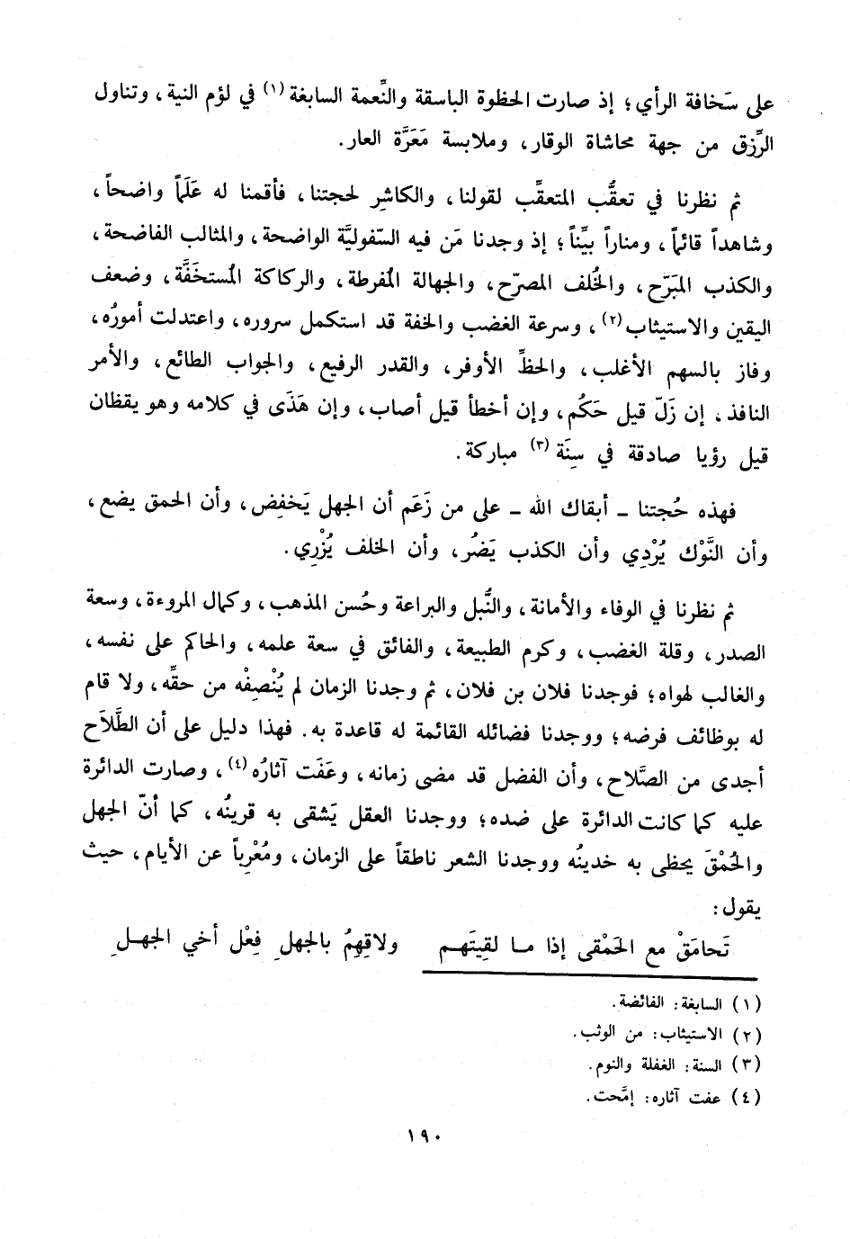ثم نظرنا في الوفاء والأمانة، والنّبل والبراعة وحسن المذهب، وكمال المروءة، وسعة الصدر، وقلة الغضب، وكرم الطبيعة، والفائق في سعة علمه، والحاكم على نفسه، والغالب لهواه؛ فوجدنا فلان بن فلان، ثم وجدنا الزمان لم ينصفه من حقّه، ولا قام له بوظائف فرضه؛ ووجدنا فضائله القائمة له قاعدة به. فهذا دليل على أن الطّلاح أجدى من الصّلاح، وأن الفضل قد مضى زمانه، وعفت آثاره «4» ، وصارت الدائرة عليه كما كانت الدائرة على ضده؛ ووجدنا العقل يشقى به قرينه، كما أنّ الجهل والحمق يحظى به خدينه ووجدنا الشعر ناطقا على الزمان، ومعربا عن الأيام، حيث يقول: