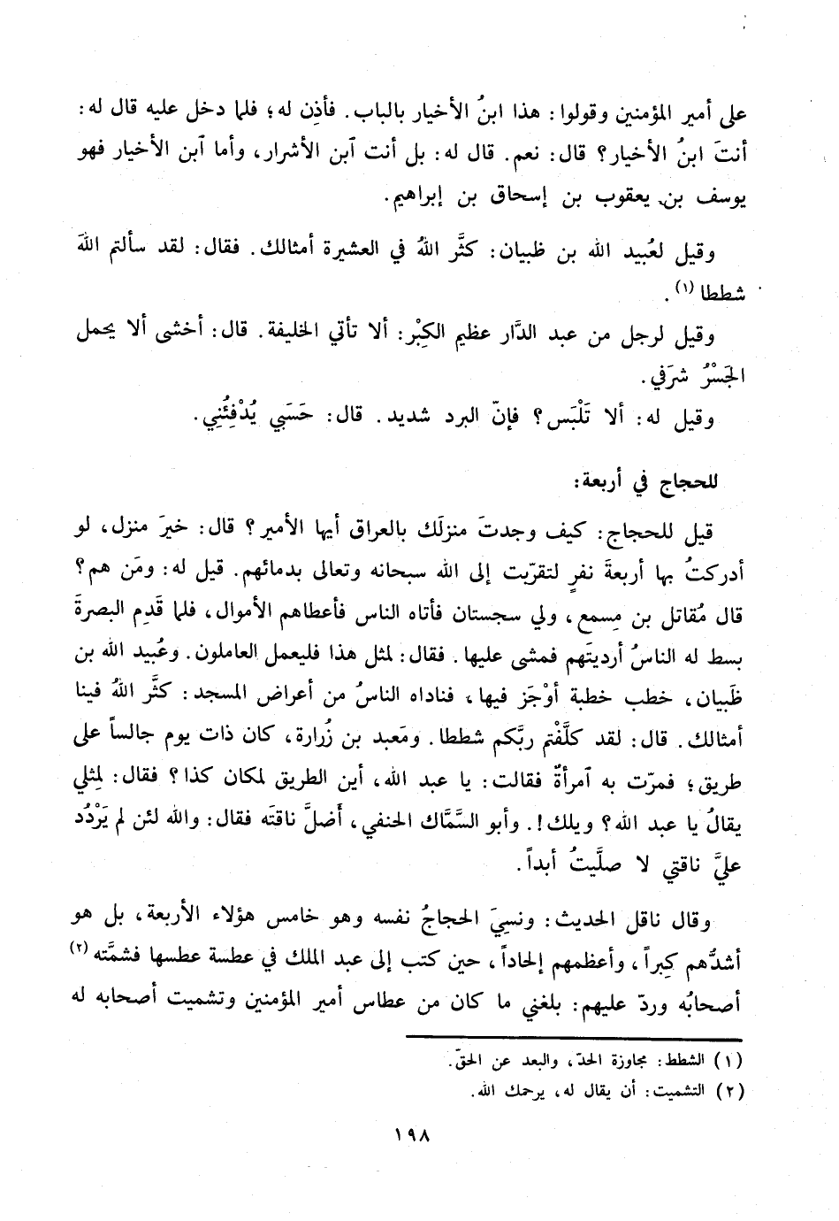 قيل للحجاج: كيف وجدت منزلك بالعراق أيها الأمير؟ قال: خير منزل، لو أدركت بها أربعة نفر لتقرّبت إلى الله سبحانه وتعالى بدمائهم. قيل له: ومن هم؟