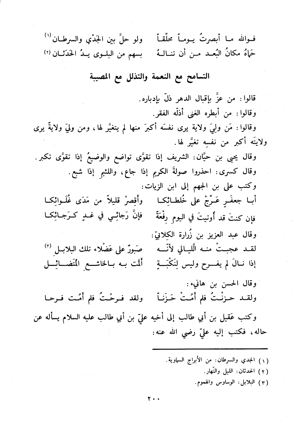 لقد عجبت منه الّليالي لأنّه ... صبور على عضلاء تلك البلابل «3»
