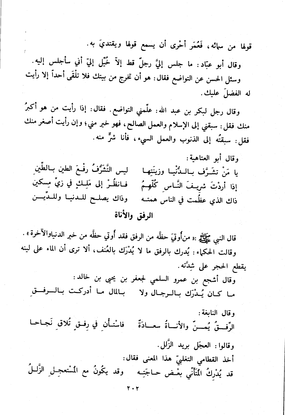 وقالت الحكماء: يدرك بالرفق ما لا يدرك بالعنف، ألا ترى أن الماء على لينه يقطع الحجر على شدّته.
