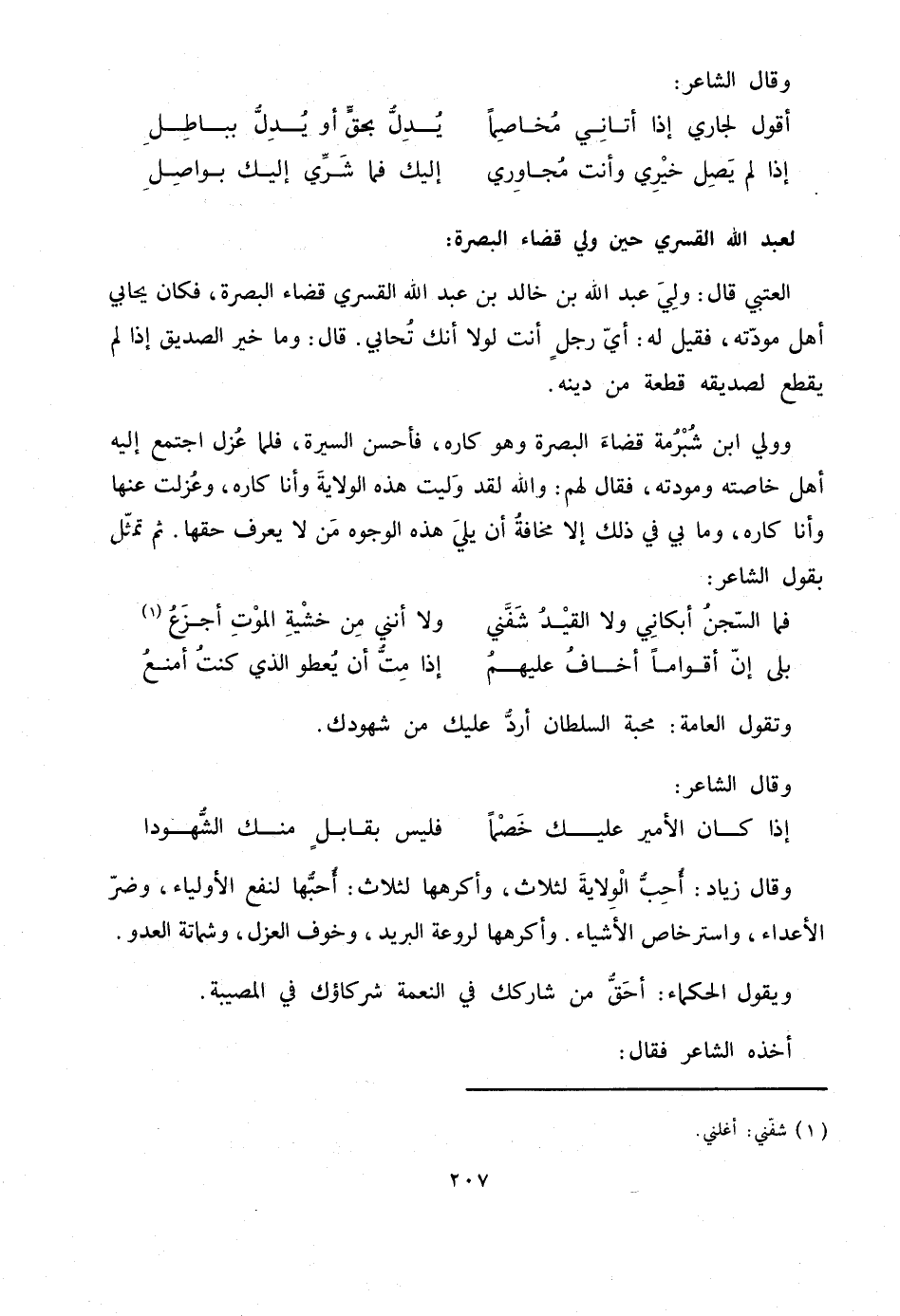 العتبي قال: ولي عبد الله بن خالد بن عبد الله القسري قضاء البصرة، فكان يحابي أهل مودّته، فقيل له: أيّ رجل أنت لولا أنك تحابي. قال: وما خير الصديق إذا لم يقطع لصديقه قطعة من دينه.