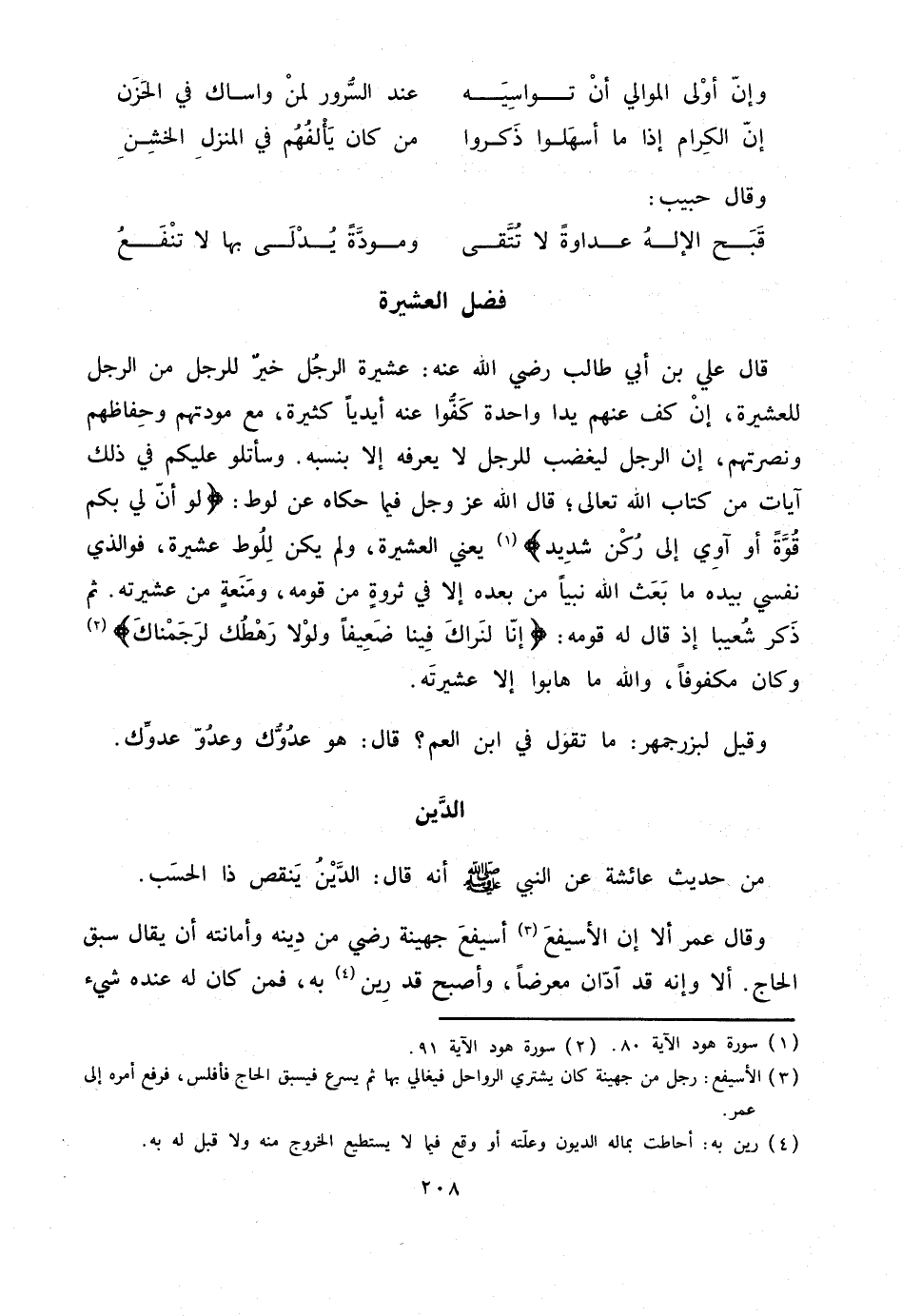 قال علي بن أبي طالب رضي الله عنه: عشيرة الرجل خير للرجل من الرجل للعشيرة، إن كف عنهم يدا واحدة كفّوا عنه أيديا كثيرة، مع مودتهم وحفاظهم ونصرتهم، إن الرجل ليغضب للرجل لا يعرفه إلا بنسبه. وسأتلو عليكم في ذلك آيات من كتاب الله تعالى؛ قال الله عز وجل فيما حكاه عن لوط: لَوْ أَنَّ لِي بِكُمْ قُوَّةً أَوْ آوِي إِلى رُكْنٍ شَدِيدٍ