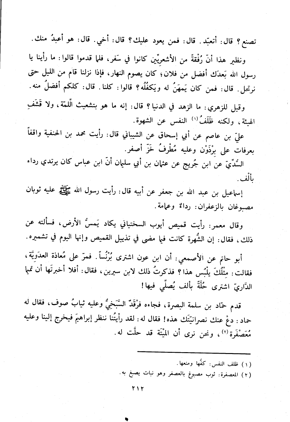 أبو حاتم عن الأصمعي: أن ابن عون اشترى برنسا. فمرّ على معاذة العدويّة، فقالت: مثلك يلبس هذا؟ فذكرت ذلك لابن سيرين، فقال: أفلا أخبرتها أن تميما الدّاريّ اشترى حلّة بألف يصلّي فيها! قدم حمّاد بن سلمة البصرة، فجاءه فرقد السّبخيّ وعليه ثياب صوف، فقال له حماد: دع عنك نصرانيّتك هذه! فقال له: لقد رأيتنا ننظر إبراهيم فيخرج إلينا وعليه معصفرة «2» ، ونحن نرى أن الميتة قد حلّت له.