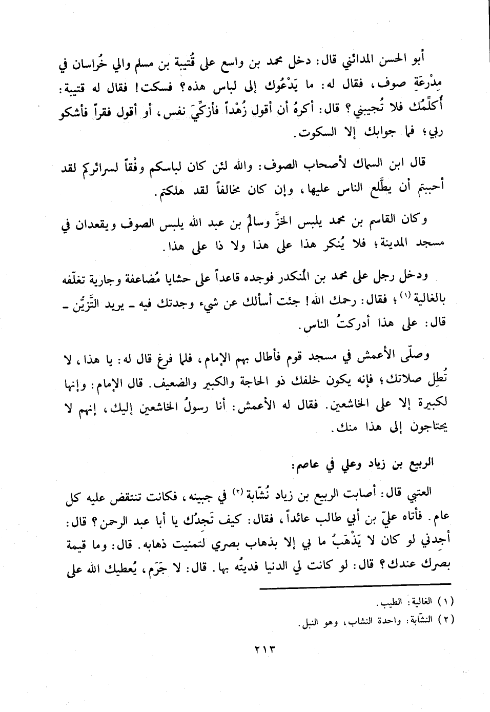 ودخل رجل على محمد بن المنكدر فوجده قاعدا على حشايا مضاعفة وجارية تغلّفه بالغالية «1» ؛ فقال: رحمك الله! جئت أسألك عن شيء وجدتك فيه- يريد التّزيّن- قال: على هذا أدركت الناس.