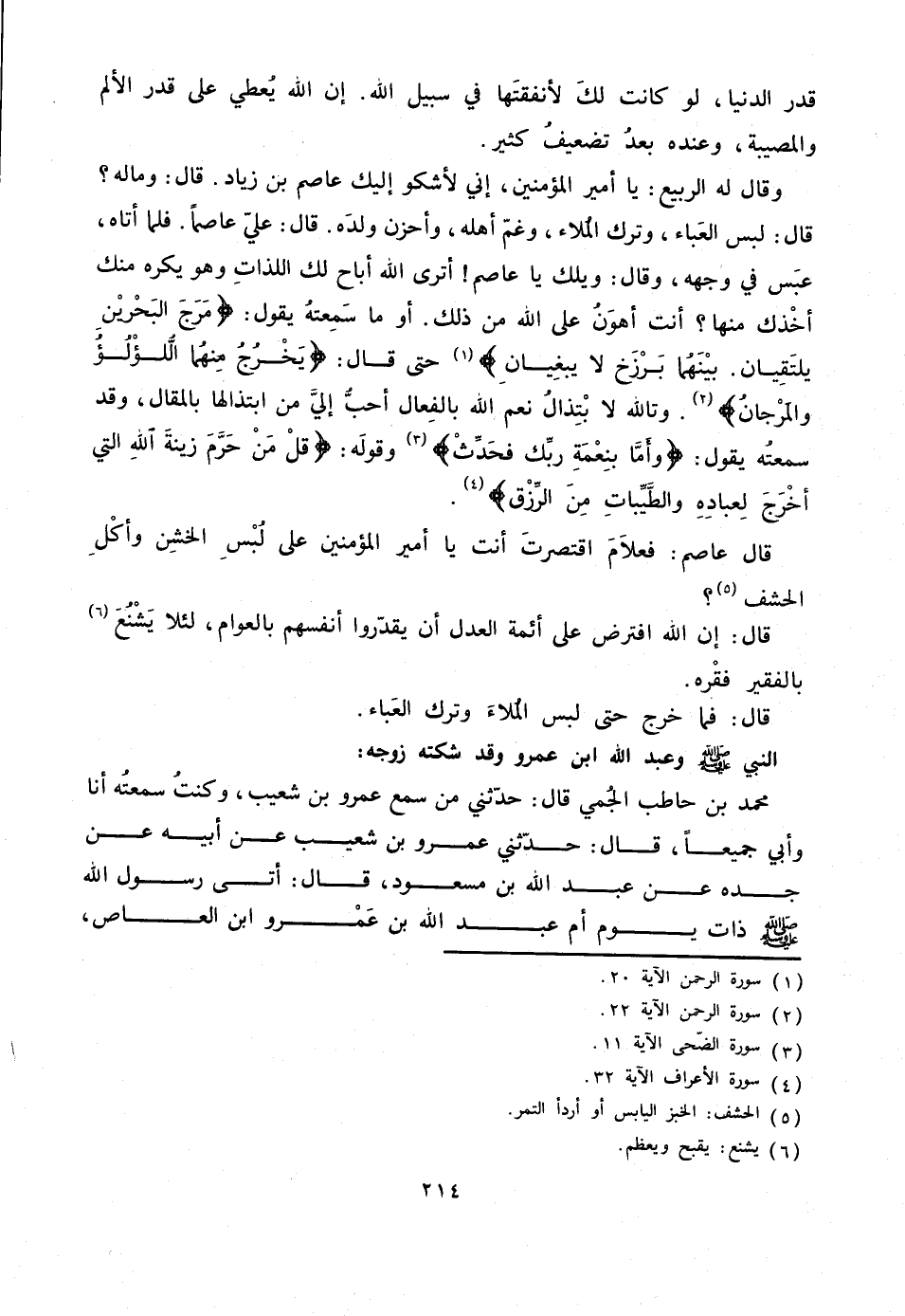 قال: لبس العباء، وترك الملاء، وغمّ أهله، وأحزن ولده. قال: عليّ عاصما. فلما أتاه، عبس في وجهه، وقال: ويلك يا عاصم! أترى الله أباح لك اللذات وهو يكره منك أخذك منها؟ أنت أهون على الله من ذلك. أو ما سمعته يقول: مَرَجَ الْبَحْرَيْنِ يَلْتَقِيانِ بَيْنَهُما بَرْزَخٌ لا يَبْغِيانِ