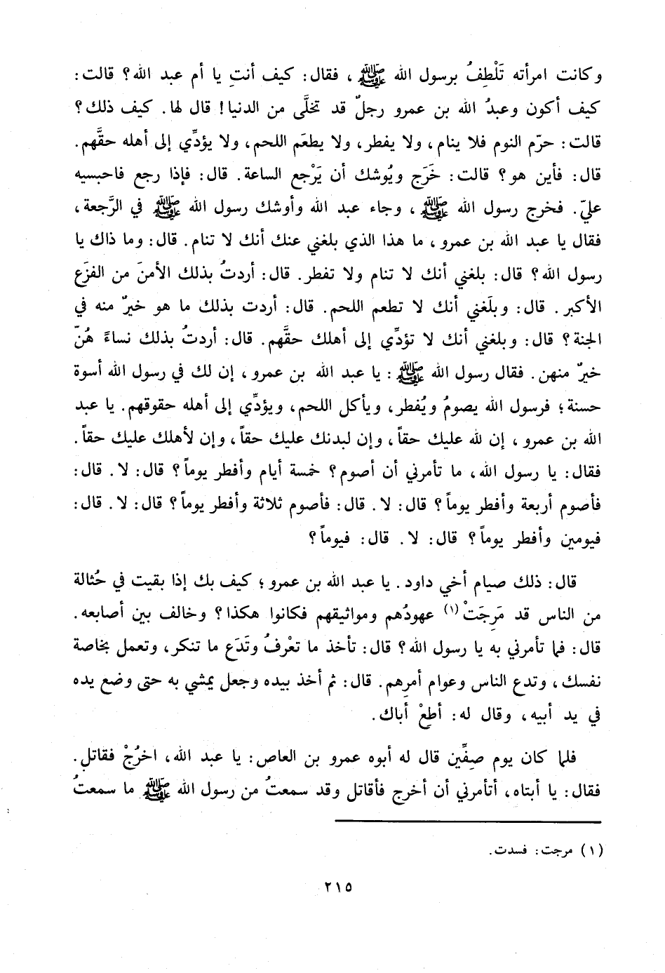 قال: فأين هو؟ قالت: خرج ويوشك أن يرجع الساعة. قال: فإذا رجع فاحبسيه عليّ. فخرج رسول الله صلّى الله عليه وسلم، وجاء عبد الله وأوشك رسول الله صلّى الله عليه وسلم في الرّجعة، فقال يا عبد الله بن عمرو، ما هذا الذي بلغني عنك أنك لا تنام. قال: وما ذاك يا رسول الله؟ قال: بلغني أنك لا تنام ولا تفطر. قال: أردت بذلك الأمن من الفزع الأكبر. قال: وبلغني أنك لا تطعم اللحم. قال: أردت بذلك ما هو خير منه في الجنة؟ قال: وبلغني أنك لا تؤدّي إلى أهلك حقّهم. قال: أردت بذلك نساء هنّ خير منهن. فقال رسول الله صلّى الله عليه وسلم: يا عبد الله بن عمرو، إن لك في رسول الله أسوة حسنة؛ فرسول الله يصوم ويفطر، ويأكل اللحم، ويؤدّي إلى أهله حقوقهم. يا عبد الله بن عمرو، إن لله عليك حقا، وإن لبدنك عليك حقا، وإن لأهلك عليك حقا.