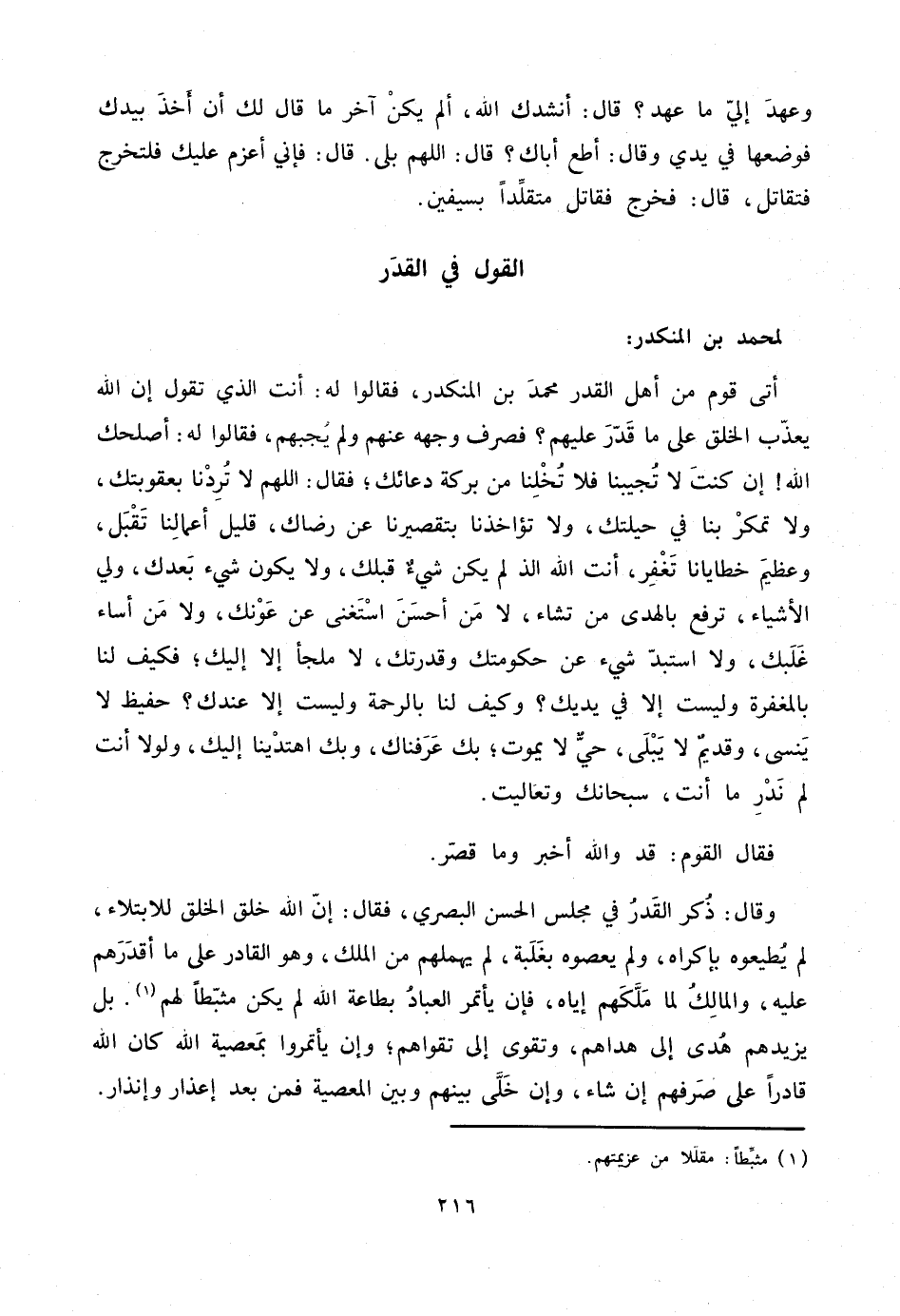 أتى قوم من أهل القدر محمد بن المنكدر، فقالوا له: أنت الذي تقول إن الله يعذّب الخلق على ما قدّر عليهم؟ فصرف وجهه عنهم ولم يجبهم، فقالوا له: أصلحك الله! إن كنت لا تجيبنا فلا تخلنا من بركة دعائك؛ فقال: اللهم لا تردنا بعقوبتك، ولا تمكر بنا في حيلتك، ولا تؤاخذنا بتقصيرنا عن رضاك، قليل أعمالنا تقبل، وعظيم خطايانا تغفر، أنت الله الذ لم يكن شيء قبلك، ولا يكون شيء بعدك، ولي الأشياء، ترفع بالهدى من تشاء، لا من أحسن استغنى عن عونك، ولا من أساء غلبك، ولا استبدّ شيء عن حكومتك وقدرتك، لا ملجأ إلا إليك؛ فكيف لنا بالمغفرة وليست إلا في يديك؟ وكيف لنا بالرحمة وليست إلا عندك؟ حفيظ لا ينسى، وقديم لا يبلى، حيّ لا يموت؛ بك عرفناك، وبك اهتدينا إليك، ولولا أنت لم ندر ما أنت، سبحانك وتعاليت.