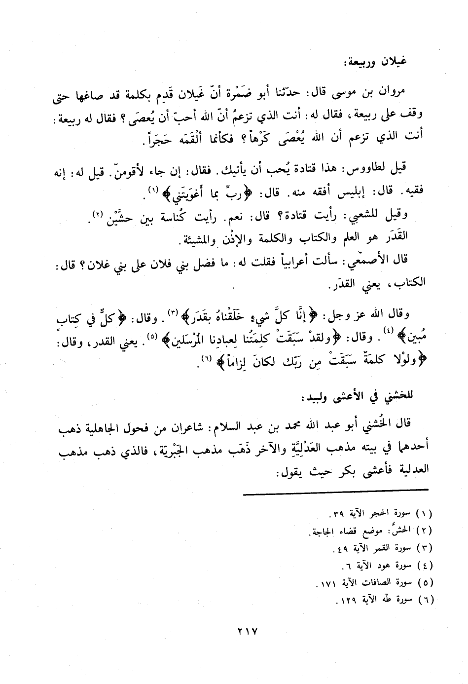 قال الخشني أبو عبد الله محمد بن عبد السلام: شاعران من فحول الجاهلية ذهب أحدهما في بيته مذهب العدليّة والآخر ذهب مذهب الجبريّة، فالذي ذهب مذهب العدلية فأعشى بكر حيث يقول: