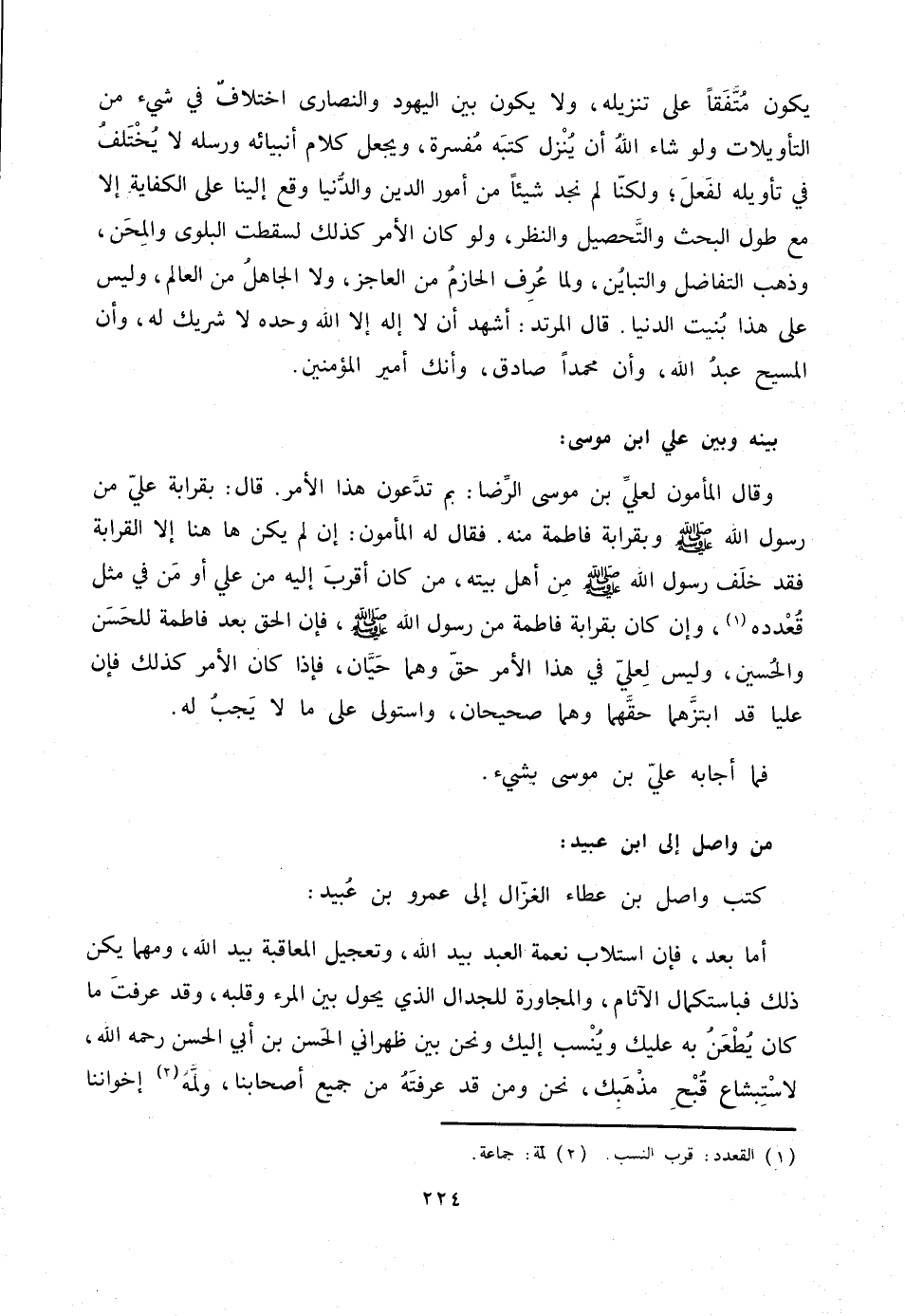 يكون متّفقا على تنزيله، ولا يكون بين اليهود والنصارى اختلاف في شيء من التأويلات ولو شاء الله أن ينزل كتبه مفسرة، ويجعل كلام أنبيائه ورسله لا يختلف في تأويله لفعل؛ ولكنّا لم نجد شيئا من أمور الدين والدّنيا وقع إلينا على الكفاية إلا مع طول البحث والتّحصيل والنظر، ولو كان الأمر كذلك لسقطت البلوى والمحن، وذهب التفاضل والتباين، ولما عرف الحازم من العاجز، ولا الجاهل من العالم، وليس على هذا بنيت الدنيا. قال المرتد: أشهد أن لا إله إلا الله وحده لا شريك له، وأن المسيح عبد الله، وأن محمدا صادق، وأنك أمير المؤمنين.