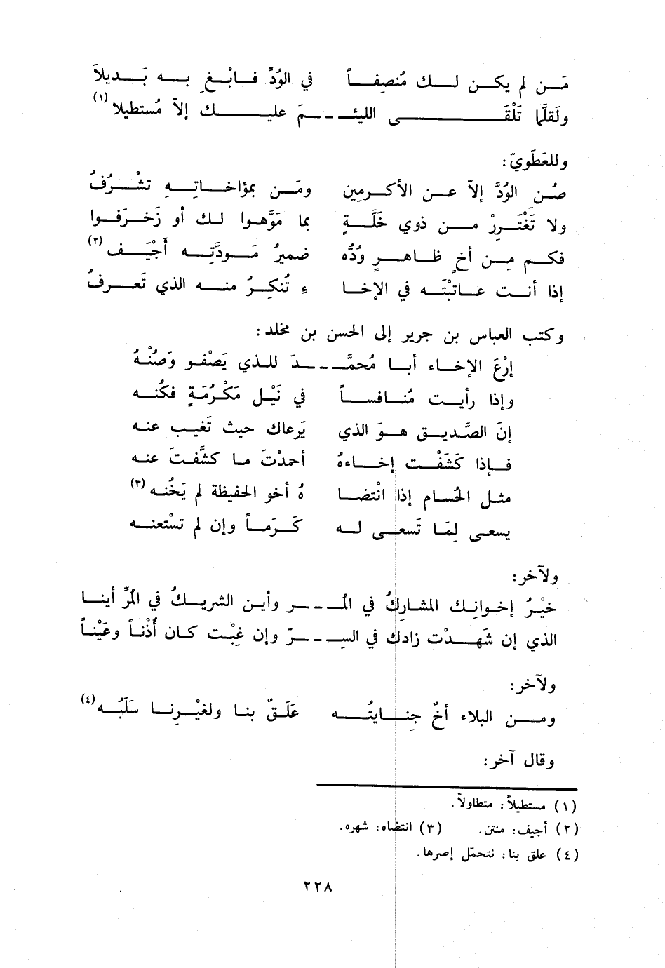 خير إخوانك المشارك في المر وأين الشريك في المرّ أينا الذي إن شهدت زادك في السرّ وإن غبت كان أذنا وعينا ولآخر: