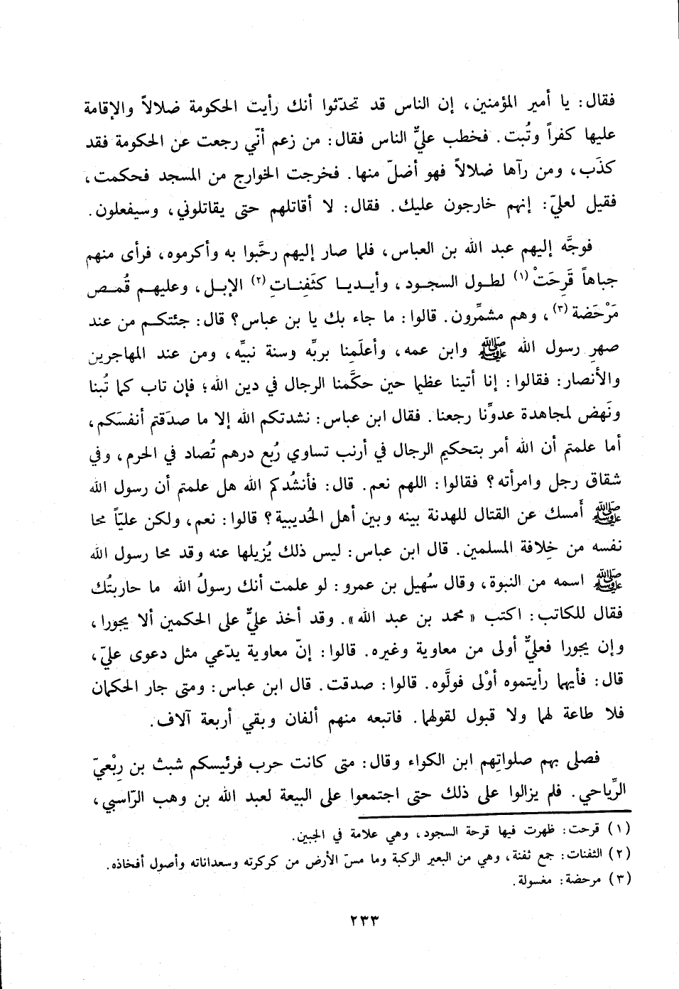 فوجّه إليهم عبد الله بن العباس، فلما صار إليهم رحّبوا به وأكرموه، فرأى منهم جباها قرحت «1» لطول السجود، وأيديا كثفنات «2» الإبل، وعليهم قمص مرحضة «3» ، وهم مشمّرون. قالوا: ما جاء بك يا بن عباس؟ قال: جئتكم من عند صهر رسول الله صلّى الله عليه وسلم وابن عمه، وأعلمنا بربّه وسنة نبيّه، ومن عند المهاجرين والأنصار: فقالوا: إنا أتينا عظيما حين حكّمنا الرجال في دين الله؛ فإن تاب كما تبنا ونهض لمجاهدة عدوّنا رجعنا. فقال ابن عباس: نشدتكم الله إلا ما صدقتم أنفسكم، أما علمتم أن الله أمر بتحكيم الرجال في أرنب تساوي ربع درهم تصاد في الحرم، وفي شقاق رجل وامرأته؟ فقالوا: اللهم نعم. قال: فأنشدكم الله هل علمتم أن رسول الله صلّى الله عليه وسلم أمسك عن القتال للهدنة بينه وبين أهل الحديبية؟ قالوا: نعم، ولكن عليّا محا نفسه من خلافة المسلمين. قال ابن عباس: ليس ذلك يزيلها عنه وقد محا رسول الله صلّى الله عليه وسلم اسمه من النبوة، وقال سهيل بن عمرو: لو علمت أنك رسول الله ما حاربتك فقال للكاتب: اكتب «محمد بن عبد الله» . وقد أخذ عليّ على الحكمين ألا يجورا، وإن يجورا فعليّ أولى من معاوية وغيره. قالوا: إنّ معاوية يدّعي مثل دعوى عليّ، قال: فأيهما رأيتموه أولى فولّوه. قالوا: صدقت. قال ابن عباس: ومتى جار الحكمان فلا طاعة لهما ولا قبول لقولهما. فاتبعه منهم ألفان وبقي أربعة آلاف.