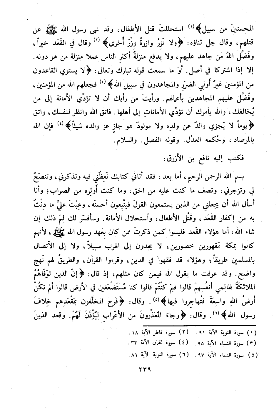 بسم الله الرحمن الرحيم، أما بعد، فقد أتاني كتابك تعظني فيه وتذكرني، وتنصح لي وتزجرني، وتصف ما كنت عليه من الحق، وما كنت أوثره من الصواب؛ وأنا أسأل الله أن يجعلني من الذين يستمعون القول فيتّبعون أحسنه، وعبت عليّ ما دنت به من إكفار القعد، وقتل الأطفال، واستحلال الأمانة. وسأفسّر لك لم ذلك إن شاء الله: أما هؤلاء القعد فليسوا كمن ذكرت ممن كان بعهد رسول الله صلّى الله عليه وسلم، لأنهم كانوا بمكة مقهورين محصورين، لا يجدون إلى الهرب سبيلا، ولا إلى الاتصال بالمسلمين طريقا؛ وهؤلاء قد فقهوا في الدين، وقرءوا القرآن، والطريق لهم نهج واضح. وقد عرفت ما يقول الله فيمن كان مثلهم، إذ قال: إِنَّ الَّذِينَ تَوَفَّاهُمُ الْمَلائِكَةُ ظالِمِي أَنْفُسِهِمْ قالُوا فِيمَ كُنْتُمْ قالُوا كُنَّا مُسْتَضْعَفِينَ فِي الْأَرْضِ قالُوا أَلَمْ تَكُنْ أَرْضُ اللَّهِ واسِعَةً فَتُهاجِرُوا فِيها