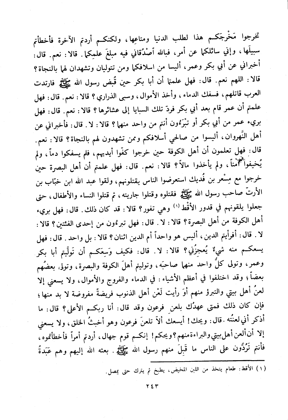 قالا: اللهم نعم. قال: فهل علمتما أن أبا بكر حين قبض رسول الله صلّى الله عليه وسلم فارتدت العرب قاتلهم، فسفك الدماء، وأخذ الأموال، وسبى الذراري؟ قالا: نعم. قال: فهل علمتم أن عمر قام بعد أبي بكر فردّ تلك السبايا إلى عشائرها؟ قالا: نعم. قال: فهل بريء عمر من أبي بكر أو تبرءون أنتم من واحد منهما؟ قالا: لا. قال: فأخبراني عن أهل النّهروان، أليسوا من صالحي أسلافكم وممن تشهدون لهم بالنجاة؟ قالا: نعم.