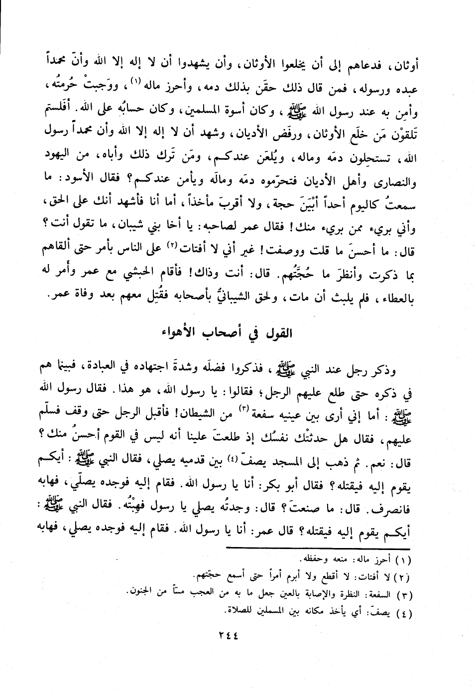 أوثان، فدعاهم إلى أن يخلعوا الأوثان، وأن يشهدوا أن لا إله إلا الله وأنّ محمدا عبده ورسوله، فمن قال ذلك حقن بذلك دمه، وأحرز ماله «1» ، ووجبت حرمته، وأمن به عند رسول الله صلّى الله عليه وسلم، وكان أسوة المسلمين، وكان حسابه على الله. أفلستم تلقون من خلع الأوثان، ورفض الأديان، وشهد أن لا إله إلا الله وأن محمدا رسول الله، تستحلون دمه وماله، ويلعن عندكم، ومن ترك ذلك وأباه، من اليهود والنصارى وأهل الأديان فتحرّموه دمه وماله ويأمن عندكم؟ فقال الأسود: ما سمعت كاليوم أحدا أبين حجة، ولا أقرب مأخذا، أما أنا فأشهد أنك على الحق، وأني بريء ممن بريء منك! فقال عمر لصاحبه: يا أخا بني شيبان، ما تقول أنت؟