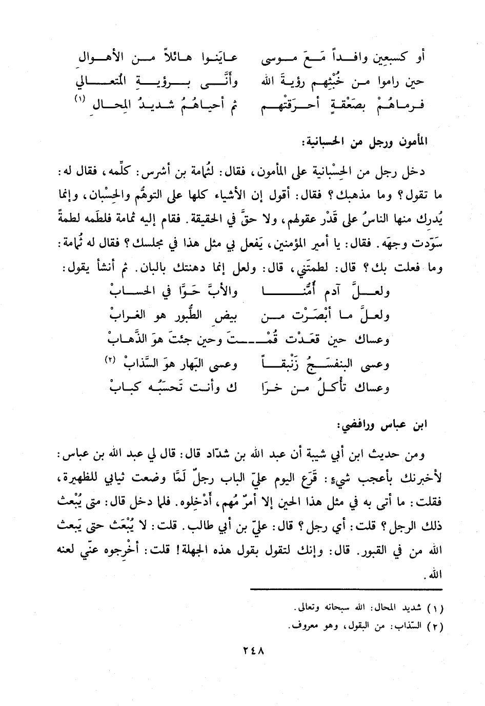 ما تقول؟ وما مذهبك؟ فقال: أقول إن الأشياء كلها على التوهّم والحسبان، وإنما يدرك منها الناس على قدر عقولهم، ولا حقّ في الحقيقة. فقام إليه ثمامة فلطمه لطمة سوّدت وجهه. فقال: يا أمير المؤمنين، يفعل بي مثل هذا في مجلسك؟ فقال له ثمامة: