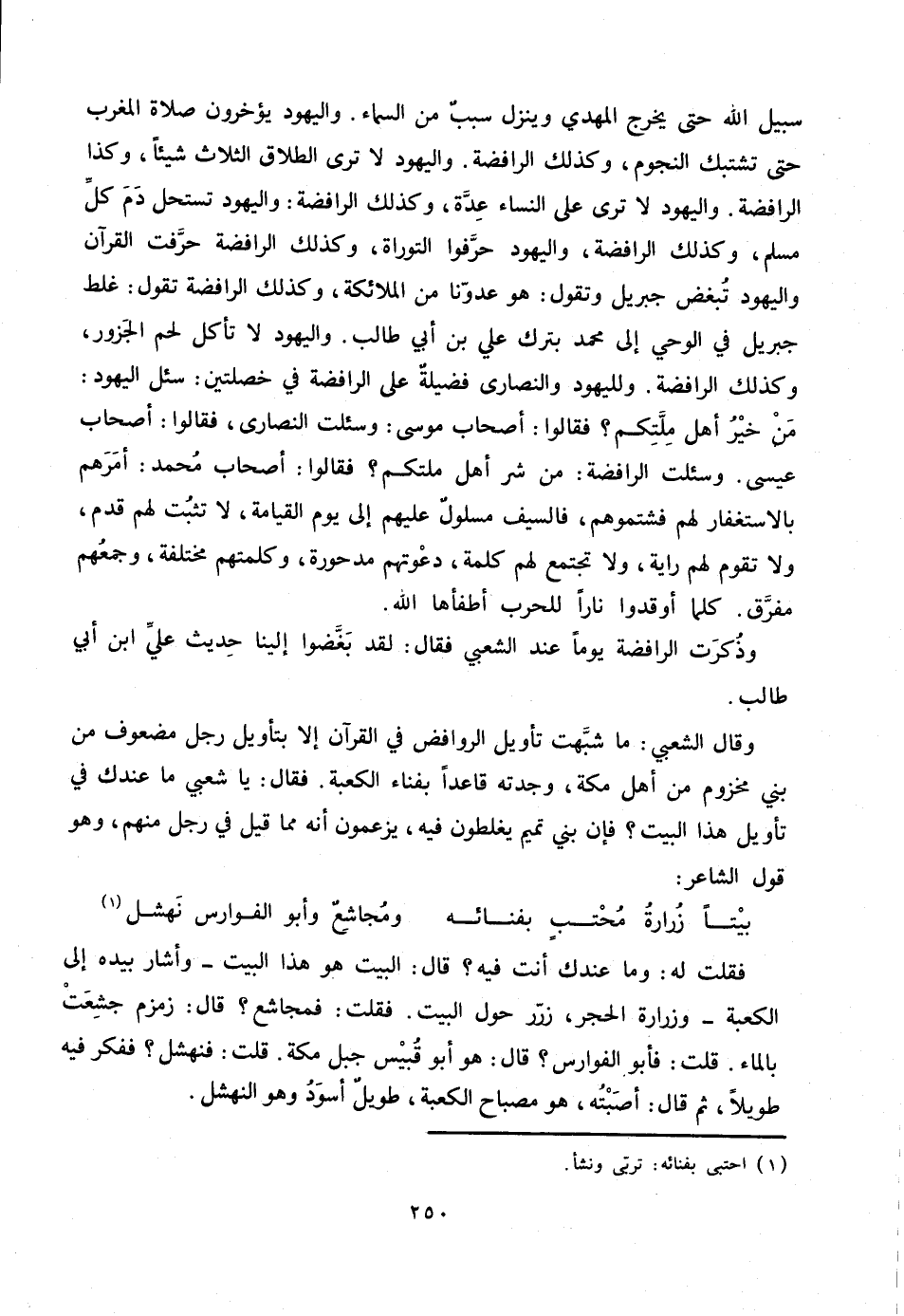 سبيل الله حتى يخرج المهدي وينزل سبب من السماء. واليهود يؤخرون صلاة المغرب حتى تشتبك النجوم، وكذلك الرافضة. واليهود لا ترى الطلاق الثلاث شيئا، وكذا الرافضة. واليهود لا ترى على النساء عدّة، وكذلك الرافضة: واليهود تستحل دم كلّ مسلم، وكذلك الرافضة، واليهود حرّفوا التوراة، وكذلك الرافضة حرّفت القرآن واليهود تبغض جبريل وتقول: هو عدوّنا من الملائكة، وكذلك الرافضة تقول: غلط جبريل في الوحي إلى محمد بترك علي بن أبي طالب. واليهود لا تأكل لحم الجزور، وكذلك الرافضة. ولليهود والنصارى فضيلة على الرافضة في خصلتين: سئل اليهود: