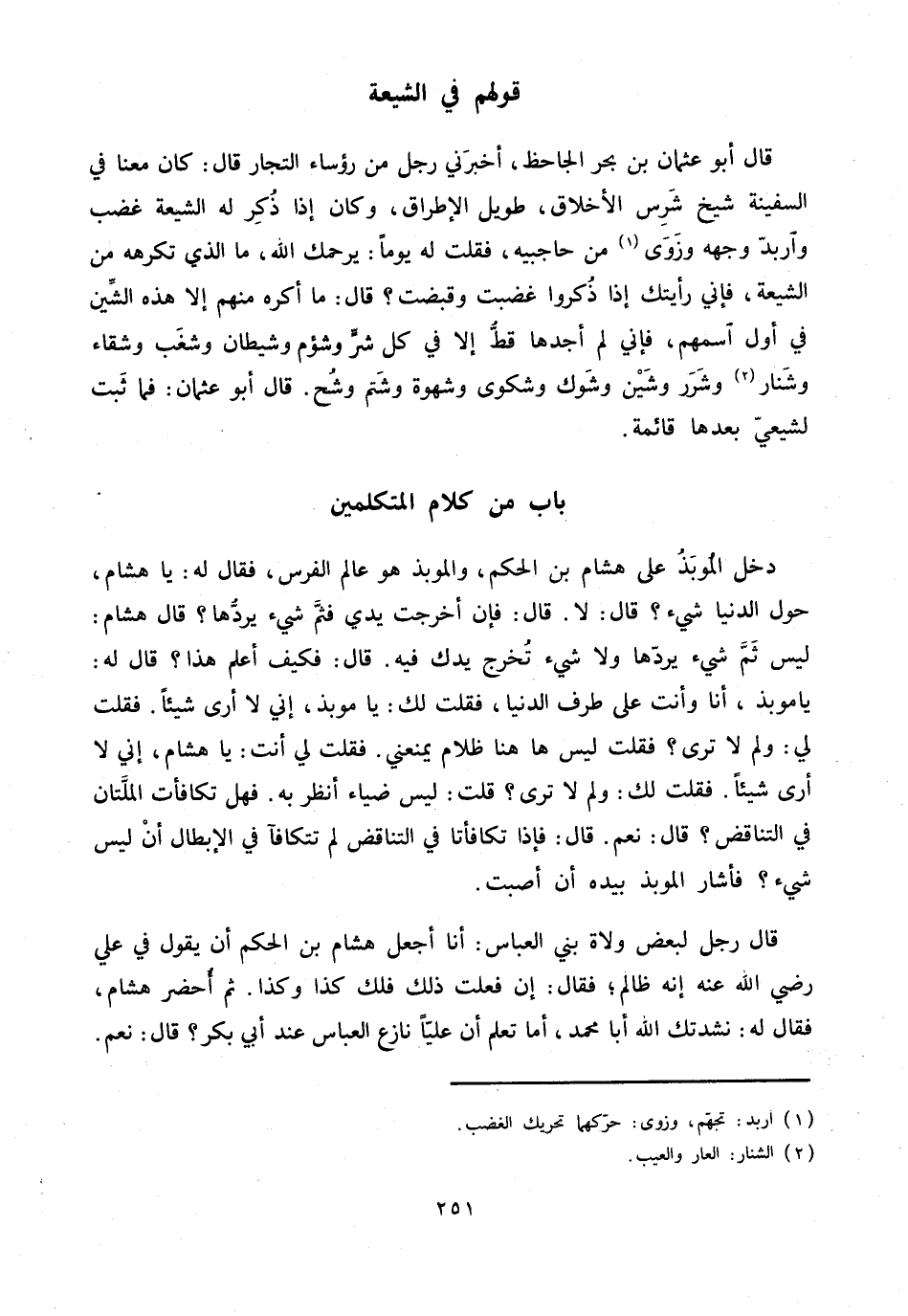 قال أبو عثمان بن بحر الجاحظ، أخبرني رجل من رؤساء التجار قال: كان معنا في السفينة شيخ شرس الأخلاق، طويل الإطراق، وكان إذا ذكر له الشيعة غضب واربد وجهه وزوى «1» من حاجبيه، فقلت له يوما: يرحمك الله، ما الذي تكرهه من الشيعة، فإني رأيتك إذا ذكروا غضبت وقبضت؟ قال: ما أكره منهم إلا هذه الشّين في أول اسمهم، فإني لم أجدها قطّ إلا في كل شرّ وشؤم وشيطان وشغب وشقاء وشنار «2» وشرر وشين وشوك وشكوى وشهوة وشتم وشح. قال أبو عثمان: فما ثبت لشيعيّ بعدها قائمة.