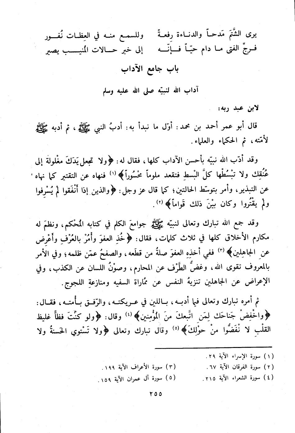 وقد جمع الله تبارك وتعالى لنبيّه صلّى الله عليه وسلم جوامع الكلم في كتابه المحكم، ونظم له مكارم الأخلاق كلها في ثلاث كلمات، فقال: خُذِ الْعَفْوَ وَأْمُرْ بِالْعُرْفِ وَأَعْرِضْ عَنِ الْجاهِلِينَ