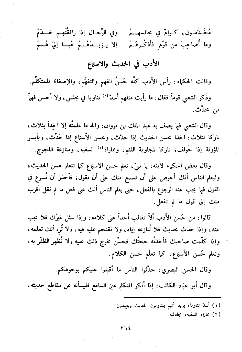 قالوا: من حسن الأدب ألّا تغالب أحدا على كلامه، وإذا سئل غيرك فلا تجب عنه، وإذا حدّث بحديث فلا تنازعه إياه، ولا تقتحم عليه فيه، ولا تره أنك تعلمه، وإذا كلّمت صاحبك فأخذته حجتك فحسّن مخرج ذلك عليه ولا تظهر الظفر به، وتعلم حسن الاستماع، كما تعلّم حسن الكلام.