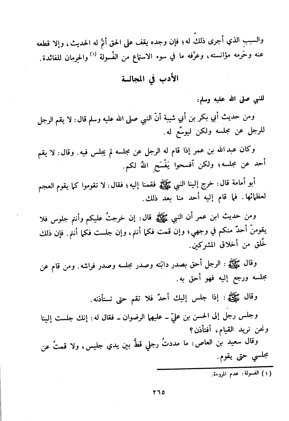 ومن حديث ابن عمر أن النبي صلّى الله عليه وسلم قال: إن خرجت عليكم وأنتم جلوس فلا يقومنّ أحد منكم في وجهي؛ وإن قمت فكما أنتم، وإن جلست فكما أنتم. فإن ذلك خلق من أخلاق المشركين.