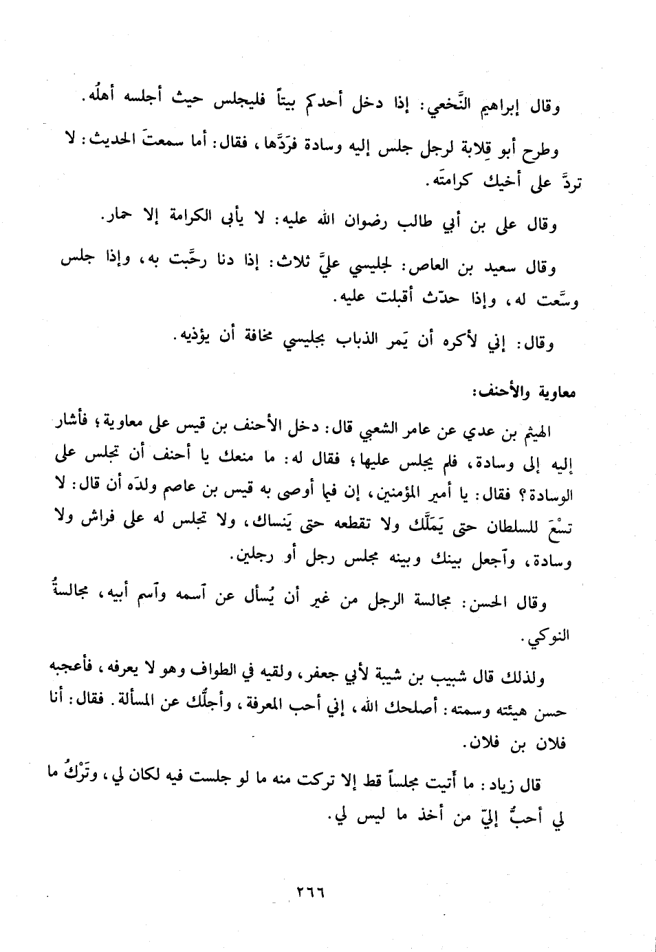 الهيثم بن عدي عن عامر الشعبي قال: دخل الأحنف بن قيس على معاوية؛ فأشار إليه إلى وسادة، فلم يجلس عليها؛ فقال له: ما منعك يا أحنف أن تجلس على الوسادة؟ فقال: يا أمير المؤمنين، إن فيما أوصى به قيس بن عاصم ولده أن قال: لا تسع للسلطان حتى يملّك ولا تقطعه حتى ينساك، ولا تجلس له على فراش ولا وسادة، واجعل بينك وبينه مجلس رجل أو رجلين.