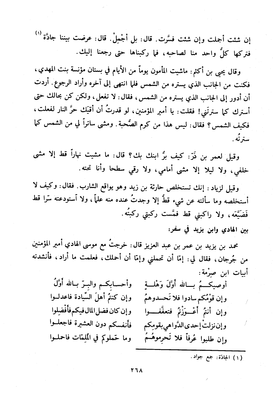 وقال يحيى بن أكثم: ما شيت المأمون يوما من الأيام في بستان مؤنسة بنت المهدي، فكنت من الجانب الذي يستره من الشمس فلما انتهى إلى آخره وأراد الرجوع. أردت أن أدور إلى الجانب الذي يستره من الشمس، فقال: لا تفعل، ولكن كن بحالك حتى أسترك كما سترتني! فقلت: يا أمير المؤمنين، لو قدرت أن أقيك حرّ النار لفعلت، فكيف الشمس؟ فقال: ليس هذا من كرم الصّحبة. ومشى ساترا لي من الشمس كما سترته.
