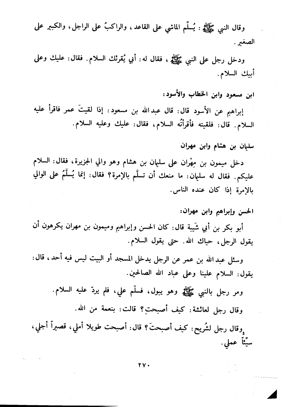 وقال النبي صلّى الله عليه وسلم: يسلّم الماشي على القاعد، والراكب على الراجل، والكبير على الصغير.