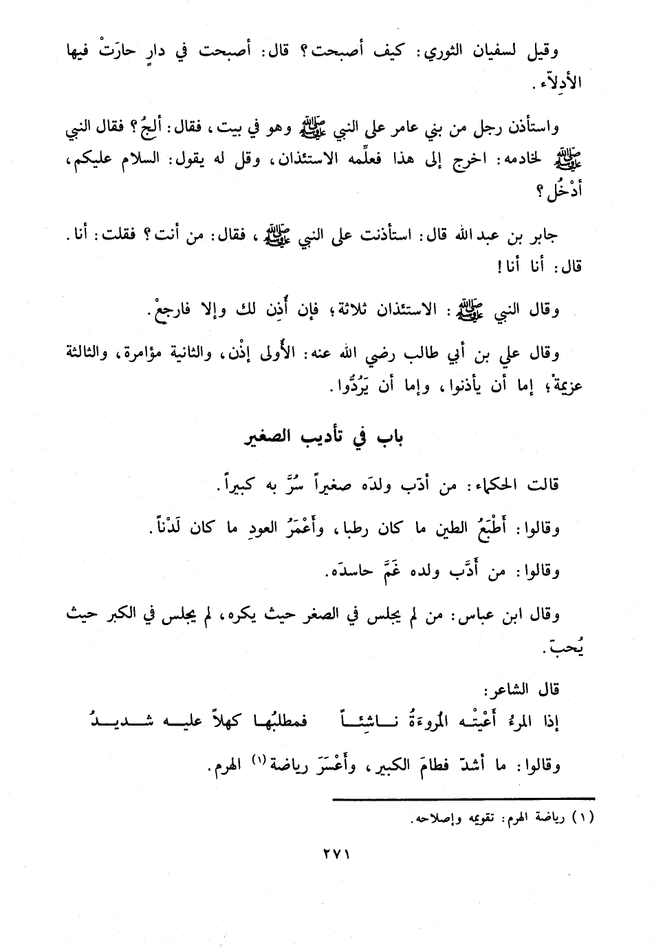 واستأذن رجل من بني عامر على النبي صلّى الله عليه وسلم وهو في بيت، فقال: ألج؟ فقال النبي صلّى الله عليه وسلم لخادمه: اخرج إلى هذا فعلّمه الاستئذان، وقل له يقول: السلام عليكم، أدخل؟