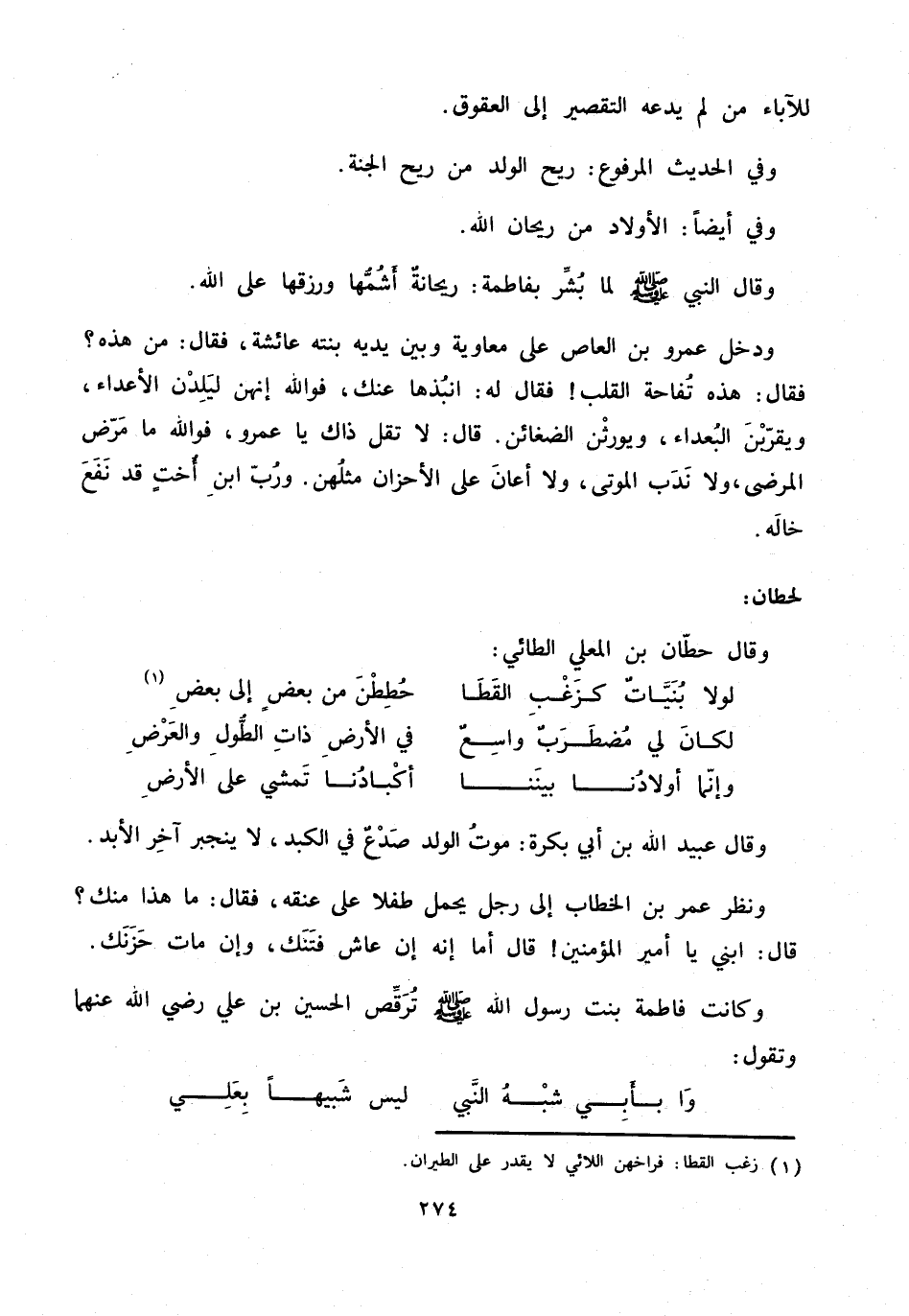 وكانت فاطمة بنت رسول الله صلّى الله عليه وسلم ترقّص الحسين بن علي رضي الله عنهما وتقول: