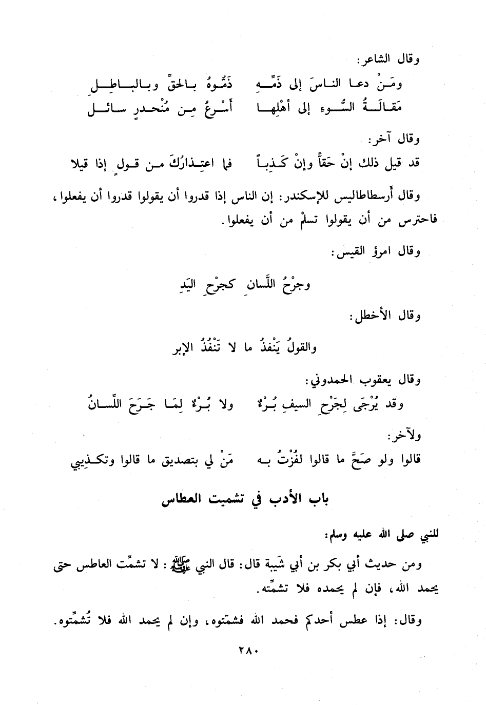 ومن حديث أبي بكر بن أبي شيبة قال: قال النبي صلّى الله عليه وسلم: لا تشمّت العاطس حتى يحمد الله، فإن لم يحمده فلا تشمّته.