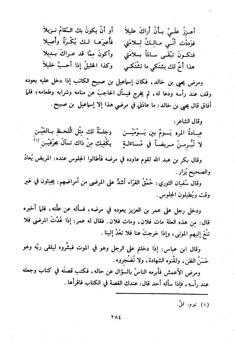 ودخل رجل على عمر بن العزيز يعوده في مرضه، فسأله عن علّته، فلما أخبره قال: من هذه العلة مات فلان، ومات فلان. فقال له عمر: إذا عدت المرضى فلا تنع إليهم الموتى، وإذا خرجت عنا فلا تعد إلينا.