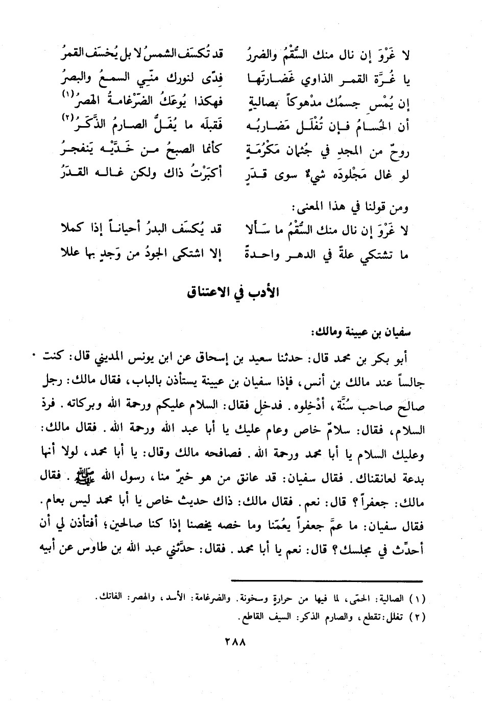 وعليك السلام يا أبا محمد ورحمة الله. فصافحه مالك وقال: يا أبا محمد، لولا أنها بدعة لعانقناك. فقال سفيان: قد عانق من هو خير منا، رسول الله صلّى الله عليه وسلم. فقال مالك: جعفرا؟ قال: نعم. فقال مالك: ذاك حديث خاص يا أبا محمد ليس بعام.