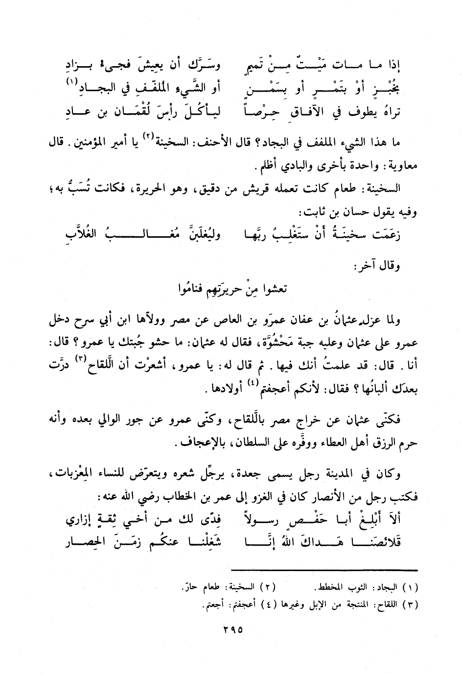 ما هذا الشيء الملفف في البجاد؟ قال الأحنف: السخينة «2» يا أمير المؤمنين. قال معاوية: واحدة بأخرى والبادي أظلم.