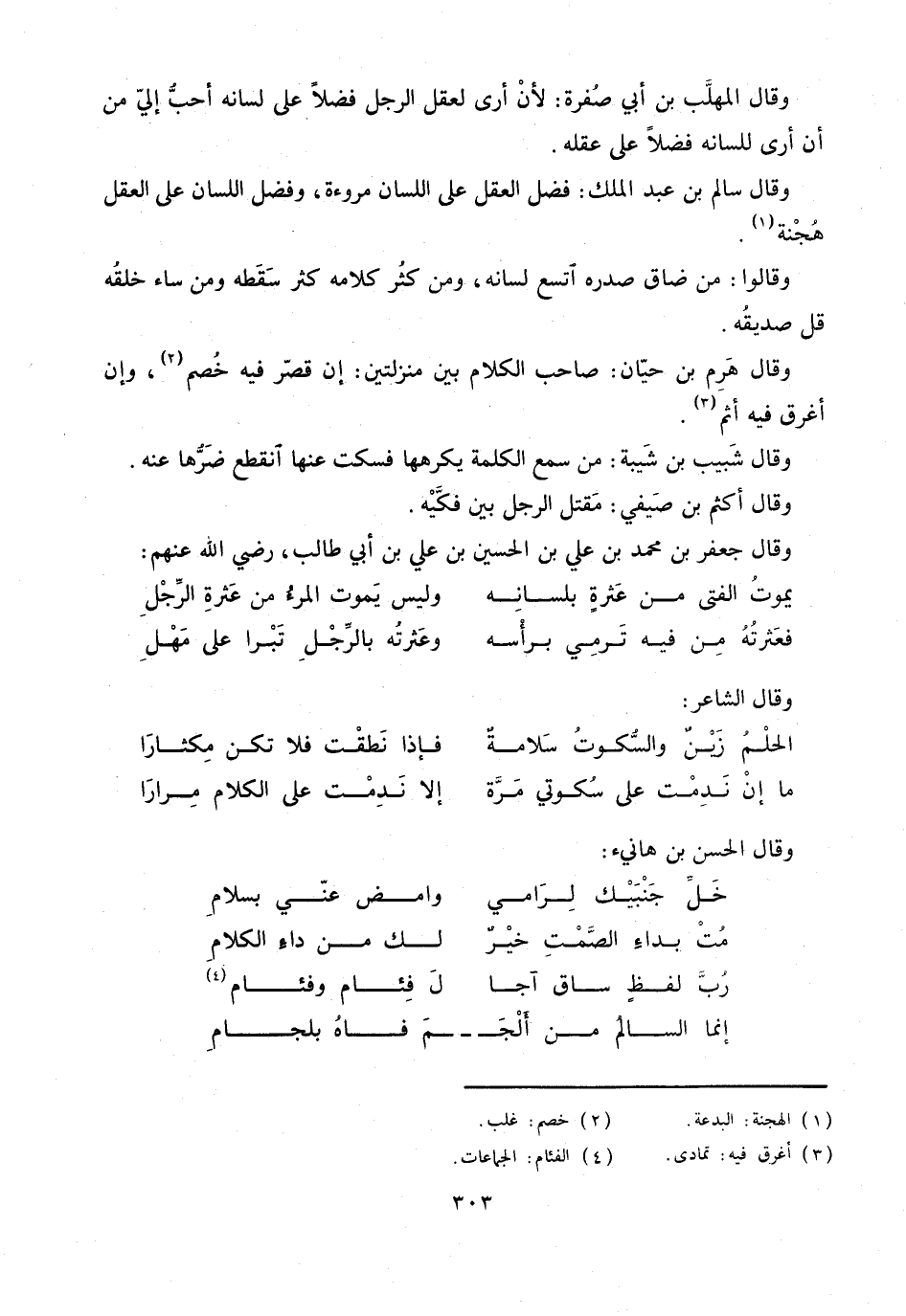 وقال سالم بن عبد الملك: فضل العقل على اللسان مروءة، وفضل اللسان على العقل هجنة «1» .