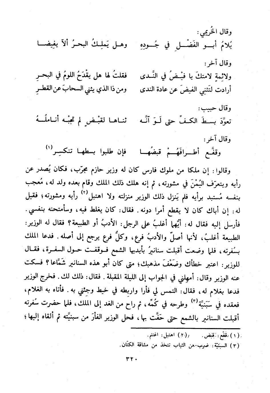 الطبيعة أغلب، لأنها أصل والأدب فرع، وكلّ فرع يرجع إلى أصله. فدعا الملك بسفرته، فلما وضعت أقبلت سنانير بأيديها الشمع فوقفت حول السفرة، فقال للوزير: اعتبر خطأك وضعف مذهبك؛ متى كان أبو هذه السنانير شمّاعا؟ فسكت عنه الوزير وقال: أمهلني في الجواب إلى الليلة المقبلة. فقال: ذلك لك. فخرج الوزير فدعا بغلام له، فقال: التمس لي فأرا واربطه في خيط وجئني به. فأتاه به الغلام، فعقده في سبنيّة «3» وطرحه في كمّه، ثم راح من الغد إلى الملك، فلما حضرت سفرته أقبلت السنانير بالشمع حتى حفّت بها، فحل الوزير الفأر من سبنيّته ثم ألقاه إليها؛