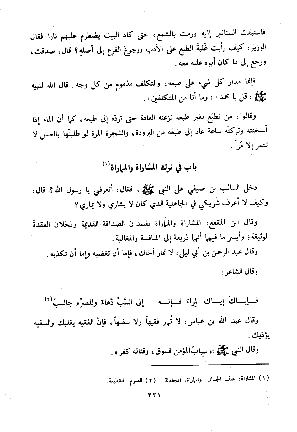 وقال ابن المقفع: المشاراة والمماراة يفسدان الصداقة القديمة ويحلان العقدة الوثيقة؛ وأيسر ما فيهما أنهما ذريعة إلى المنافسة والمغالبة.