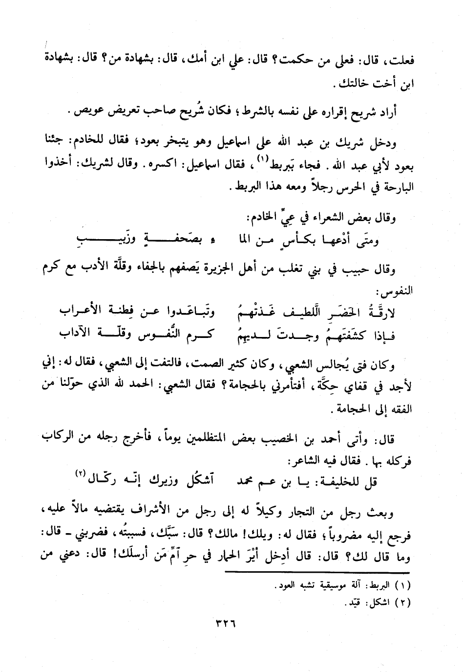 ودخل شريك بن عبد الله على اسماعيل وهو يتبخر بعود؛ فقال للخادم: جئنا بعود لأبي عبد الله. فجاء ببربط «1» ، فقال اسماعيل: اكسره. وقال لشريك: أخذوا البارحة في الحرس رجلا ومعه هذا البربط.