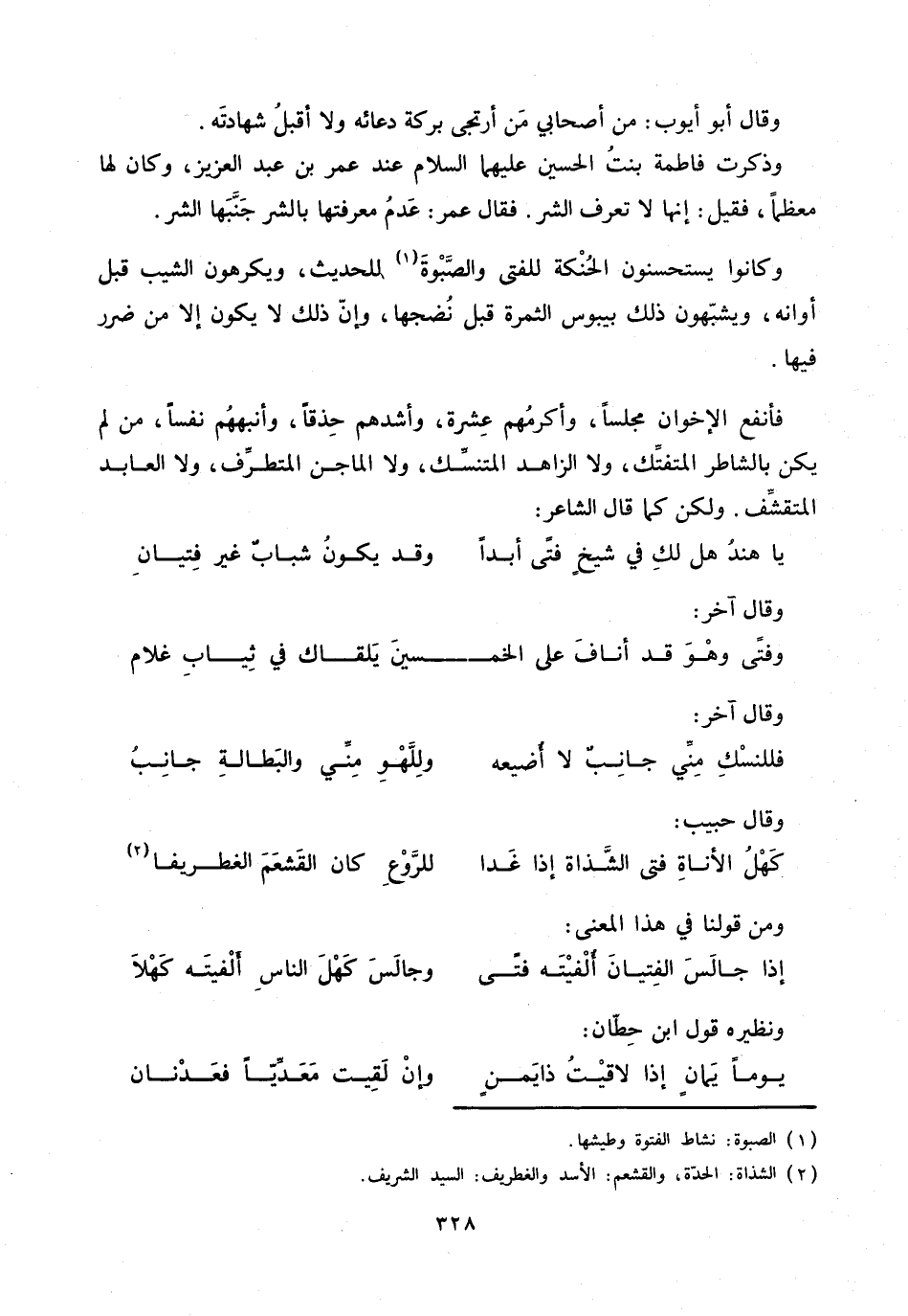 فأنفع الإخوان مجلسا، وأكرمهم عشرة، وأشدهم حذقا، وأنبههم نفسا، من لم يكن بالشاطر المتفتّك، ولا الزاهد المتنسّك، ولا الماجن المتطرّف، ولا العابد المتقشّف. ولكن كما قال الشاعر: