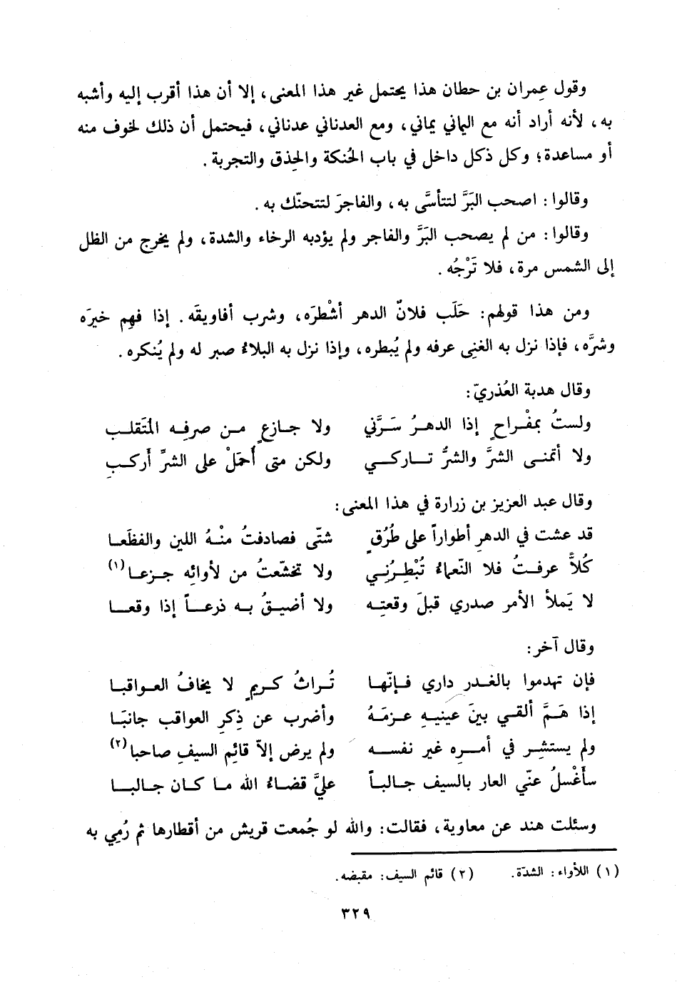 وقول عمران بن حطان هذا يحتمل غير هذا المعنى، إلا أن هذا أقرب إليه وأشبه به، لأنه أراد أنه مع اليماني يماني، ومع العدناني عدناني، فيحتمل أن ذلك لخوف منه أو مساعدة؛ وكل ذلك داخل في باب الحنكة والحذق والتجربة.