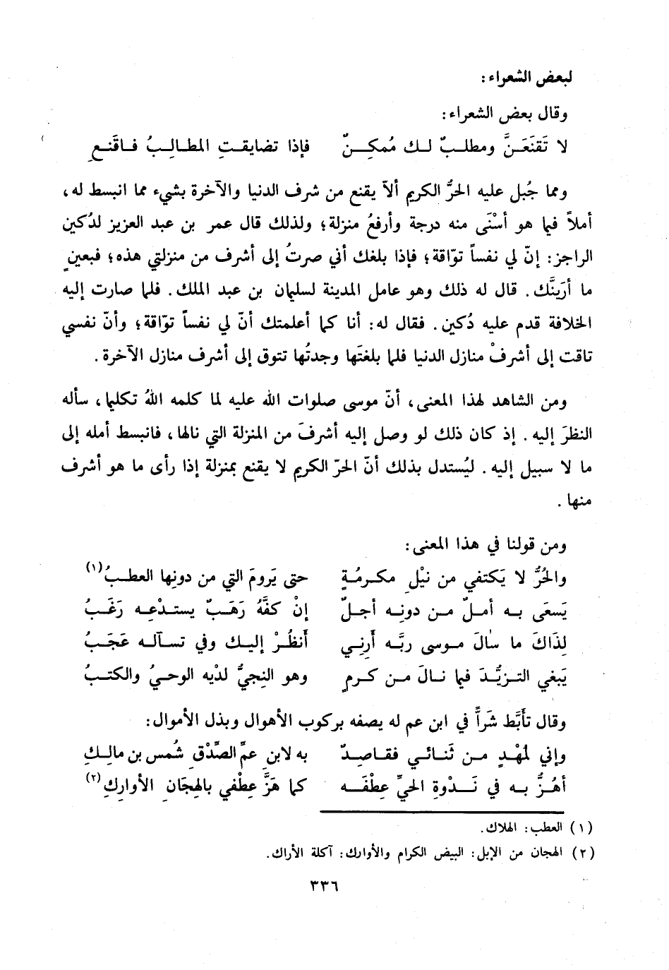 ومن الشاهد لهذا المعنى، أنّ موسى صلوات الله عليه لما كلمه الله تكليما، سأله النظر إليه. إذ كان ذلك لو وصل إليه أشرف من المنزلة التي نالها، فانبسط أمله إلى ما لا سبيل إليه. ليستدل بذلك أنّ الحرّ الكريم لا يقنع بمنزلة إذا رأى ما هو أشرف منها.