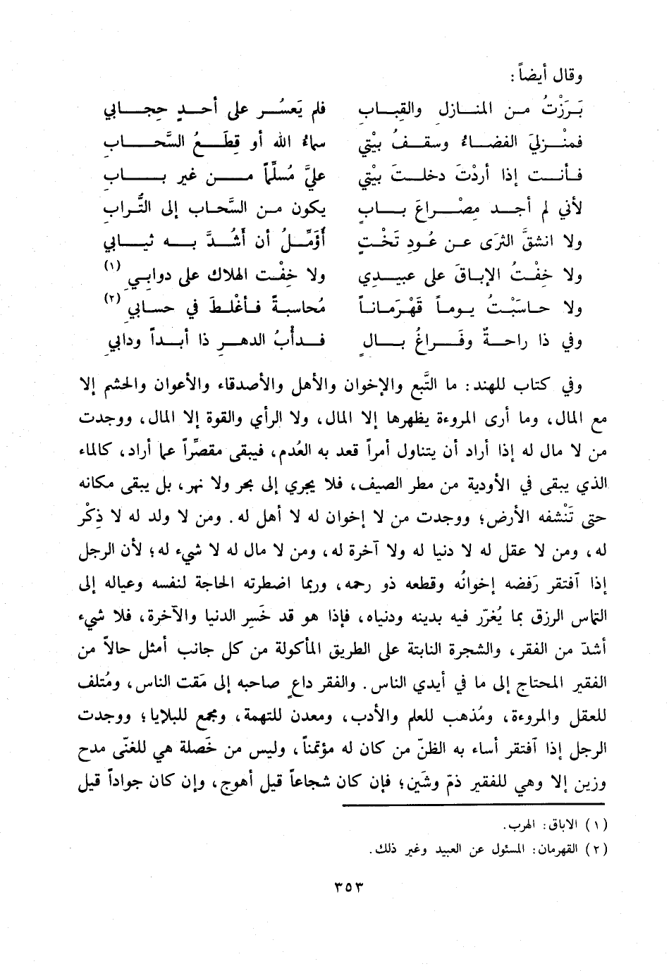 وفي كتاب للهند: ما التّبع والإخوان والأهل والأصدقاء والأعوان والحشم إلا مع المال، وما أرى المروءة يظهرها إلا المال، ولا الرأي والقوة إلا المال، ووجدت من لا مال له إذا أراد أن يتناول أمرا قعد به العدم، فيبقى مقصّرا عما أراد، كالماء الذي يبقى في الأودية من مطر الصيف، فلا يجري إلى بحر ولا نهر، بل يبقى مكانه حتى تنشفه الأرض؛ ووجدت من لا إخوان له لا أهل له. ومن لا ولد له لا ذكر له، ومن لا عقل له لا دنيا له ولا آخرة له، ومن لا مال له لا شيء له؛ لأن الرجل إذا افتقر رفضه إخوانه وقطعه ذو رحمه، وربما اضطرته الحاجة لنفسه وعياله إلى التماس الرزق بما يغرّر فيه بدينه ودنياه، فإذا هو قد خسر الدنيا والآخرة، فلا شيء أشدّ من الفقر، والشجرة النابتة على الطريق المأكولة من كل جانب أمثل حالا من الفقير المحتاج إلى ما في أيدي الناس. والفقر داع صاحبه إلى مقت الناس، ومتلف للعقل والمروءة، ومذهب للعلم والأدب، ومعدن للتهمة، ومجمع للبلايا؛ ووجدت الرجل إذا افتقر أساء به الظنّ من كان له مؤتمنا، وليس من خصلة هي للغنىّ مدح وزين إلا وهي للفقير ذمّ وشين؛ فإن كان شجاعا قيل أهوج، وإن كان جوادا قيل