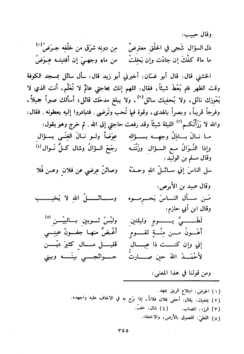 الخشني قال: قال أبو غسّان: أخبرني أبو زيد قال: سأل سائل بمسجد الكوفة وقت الظهر فلم يعط شيئا، فقال: اللهم إنك بحاجتي عالم لا تعلّم، أنت الذي لا يعوزك نائل، ولا يحفيك سائل «2» ، ولا يبلغ مدحك قائل؛ أسألك صبرا جميلا، وفرجا قريبا، وبصرا بالهدى، وقوة فيما تحب وترضى. فتبادروا إليه يعطونه. فقال: