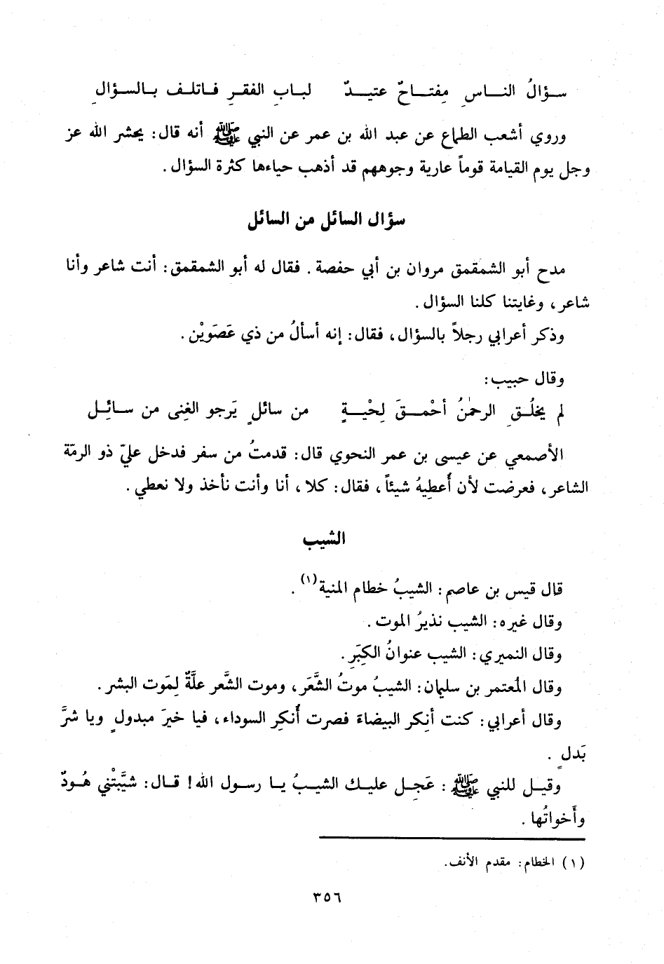 وروي أشعب الطماع عن عبد الله بن عمر عن النبي صلّى الله عليه وسلم أنه قال: يحشر الله عز وجل يوم القيامة قوما عارية وجوههم قد أذهب حياءها كثرة السؤال.