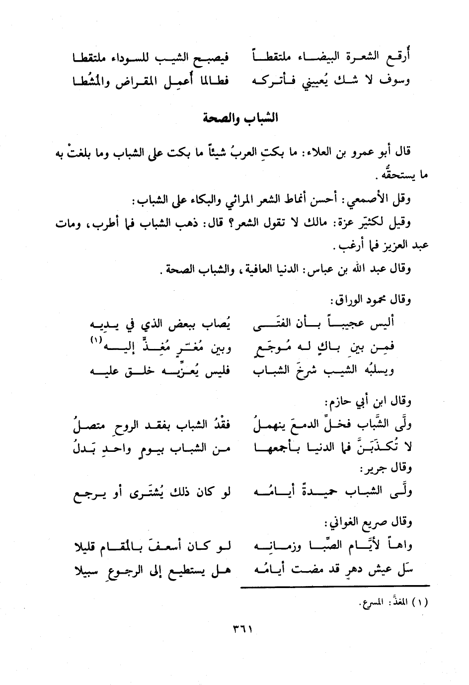 قال أبو عمرو بن العلاء: ما بكت العرب شيئا ما بكت على الشباب وما بلغت به ما يستحقّه.