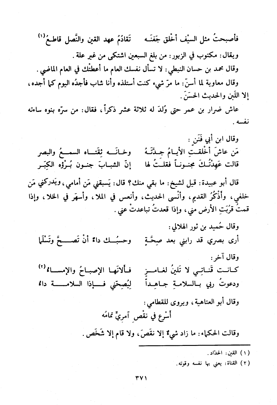 قال أبو عبيدة: قيل لشيخ: ما بقي منك؟ قال: يسبقني من أمامي، ويدركني من خلفي، وأذكر القديم، وأنسى الحديث، وأنعس في الملا، وأسهر في الخلا، وإذا قمت قربت الأرض مني، وإذا قعدت تباعدت عني.
