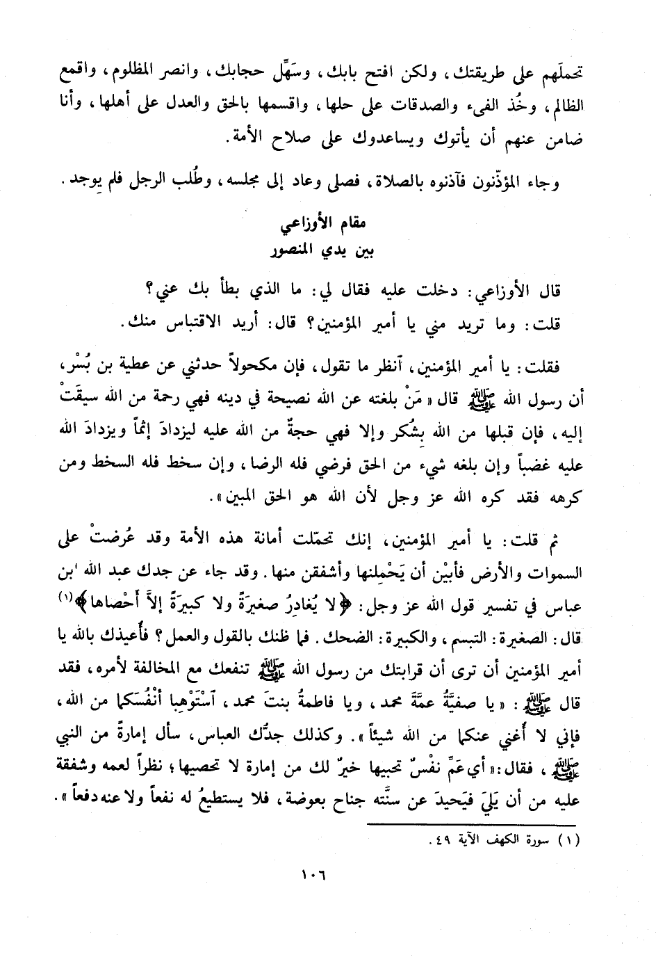 «1» قال: الصغيرة: التبسم، والكبيرة: الضحك. فما ظنك بالقول والعمل؟ فأعيذك بالله يا أمير المؤمنين أن ترى أن قرابتك من رسول الله صلّى الله عليه وسلم تنفعك مع المخالفة لأمره، فقد قال صلّى الله عليه وسلم: «يا صفيّة عمّة محمد، ويا فاطمة بنت محمد، استوهبا أنفسكما من الله، فإني لا أغني عنكما من الله شيئا» . وكذلك جدّك العباس، سأل إمارة من النبي صلّى الله عليه وسلم، فقال: «أي عمّ نفس تحبيها خير لك من إمارة لا تحصيها؛ نظرا لعمه وشفقة عليه من أن يلي فيحيد عن سنّته جناح بعوضة، فلا يستطيع له نفعا ولا عنه دفعا» .