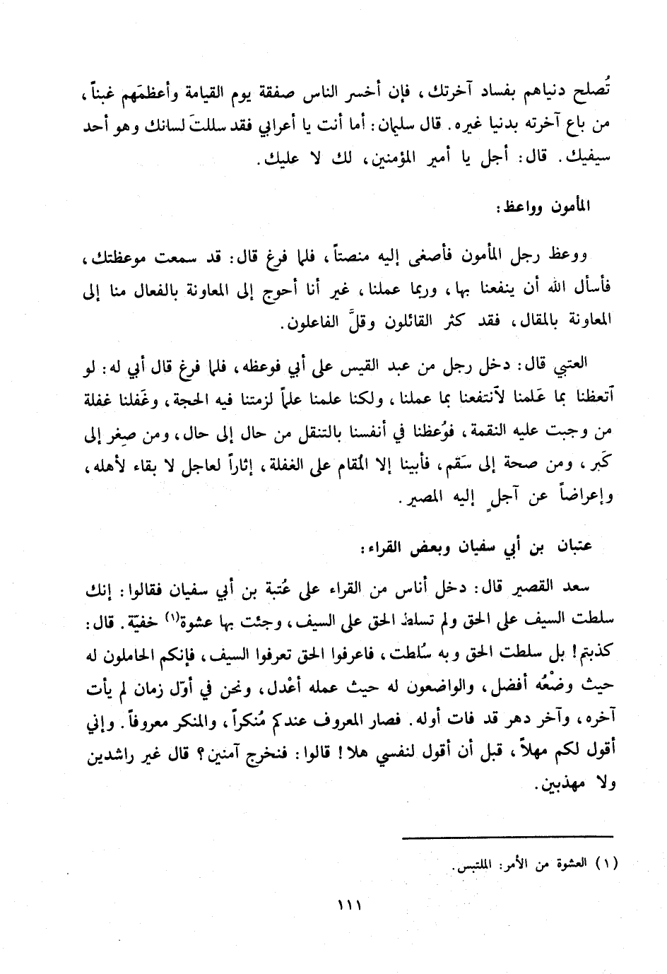 تصلح دنياهم بفساد آخرتك، فإن أخسر الناس صفقة يوم القيامة وأعظمهم غبنا، من باع آخرته بدنيا غيره. قال سليمان: أما أنت يا أعرابي فقد سللت لسانك وهو أحد سيفيك. قال: أجل يا أمير المؤمنين، لك لا عليك.