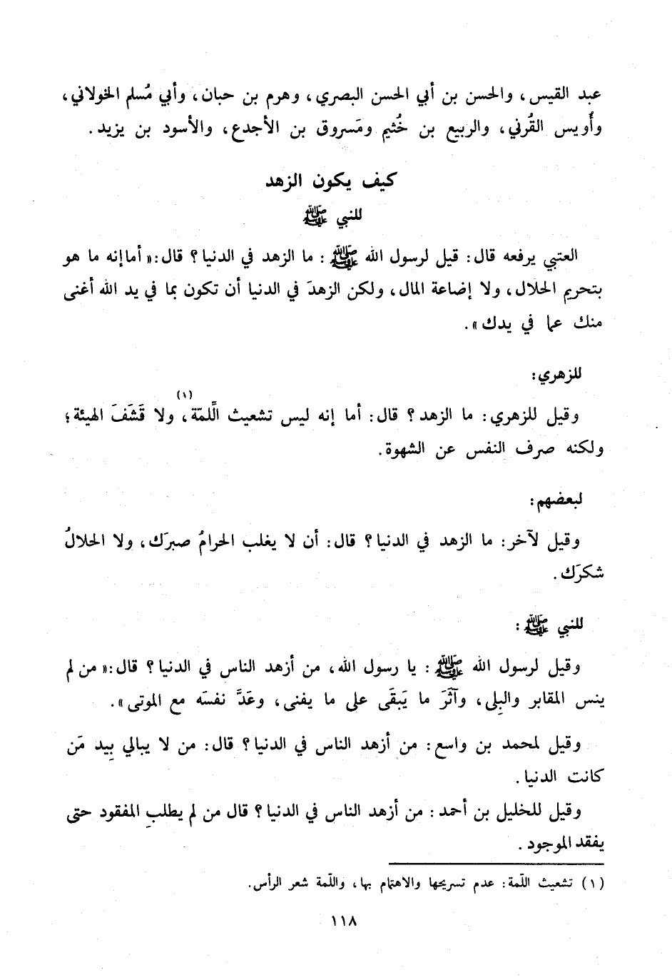 وقيل للزهري: ما الزهد؟ قال: أما إنه ليس تشعيث الّلمّة، «1» ولا قشف الهيئة؛ ولكنه صرف النفس عن الشهوة.